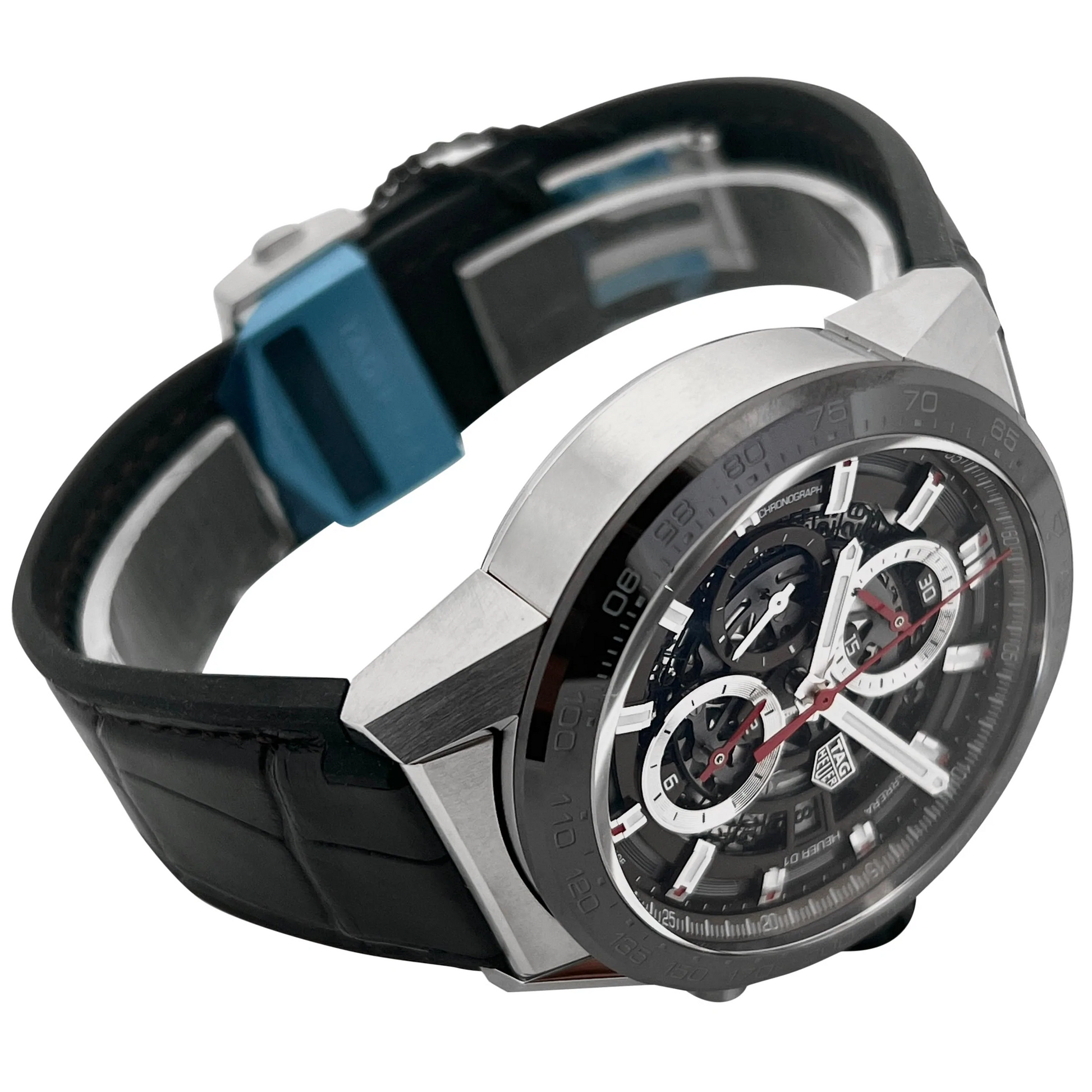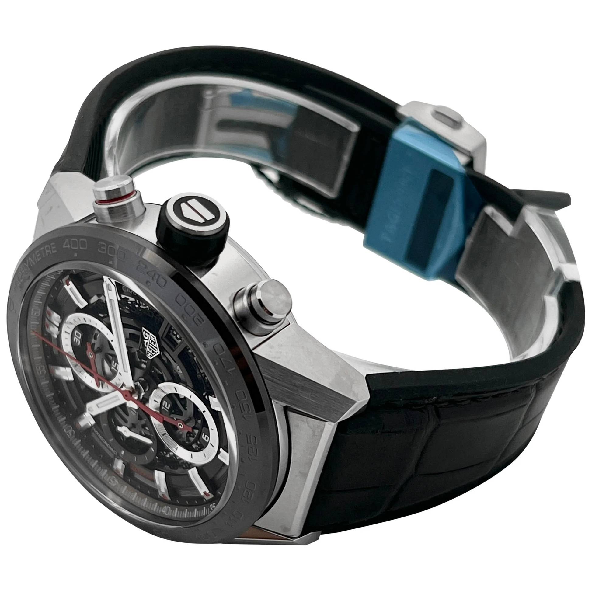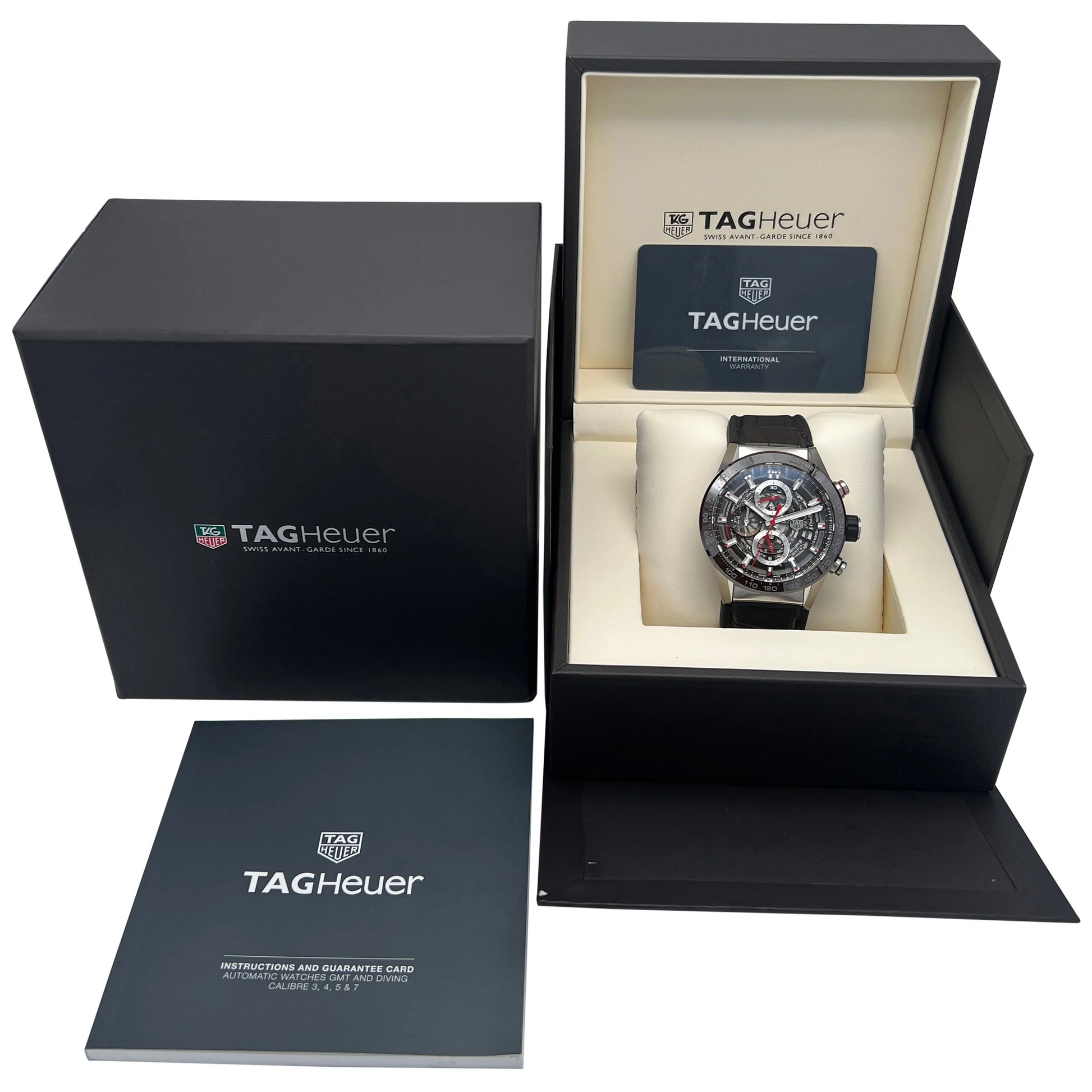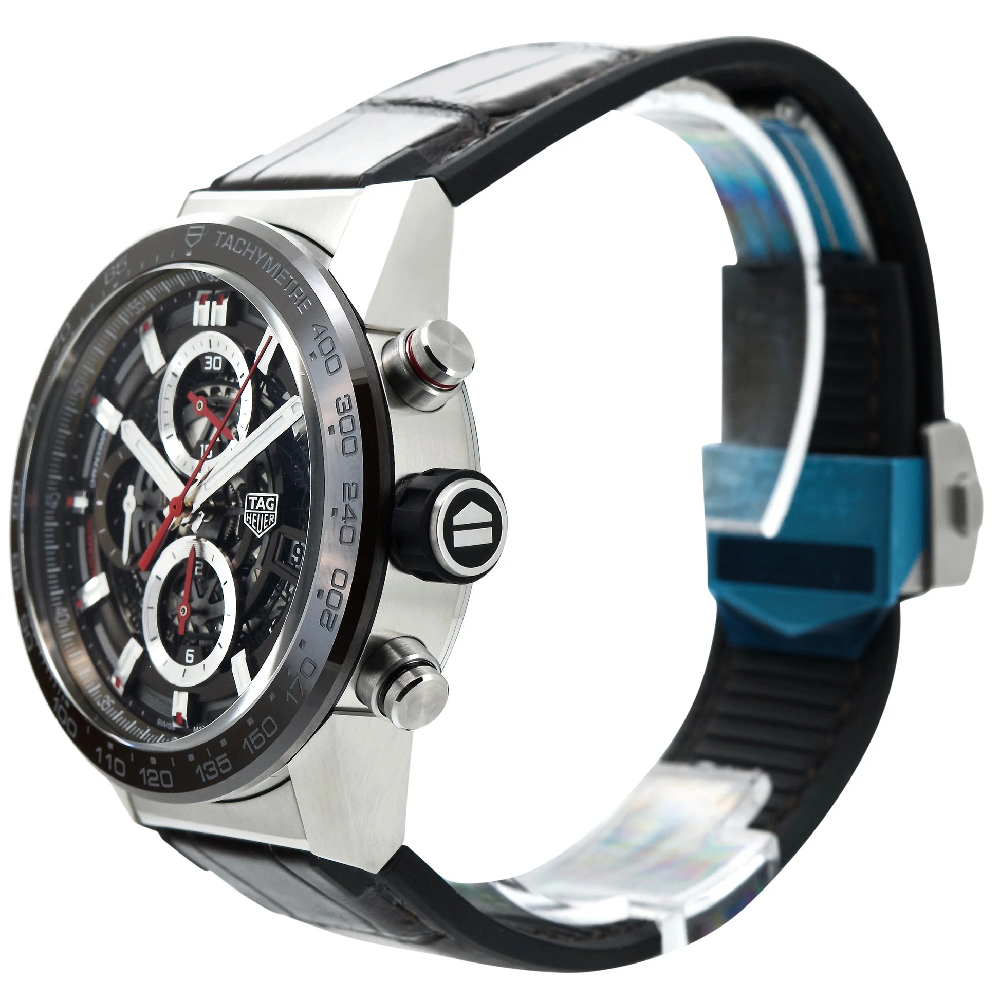 Case: Modular construction. Middle Case & Case Back: Brushed & polished stainless steel. Lugs: Stainless steel with brushed & polished finishes. Bezel: Fine brushed & polished brown ceramic bezel with engraved tachymeter scale. Crown: Satin finished stainless steel with rubber grip. Chrono pushers: Satin finished stainless steel. Dial: Skeletonized with brown & silver rims. Applied brushed & polished steel index hour markers with luminous fill. Fine printed minute, seconds & fractions of a second track on dial flange. Time related hands: polished& sand-blasted finished hands, hour & minutes with luminous fill. Chronograph related hands: red. Brown rimmed small seconds sub-dial located at the 9 o'clock position. Date disc with black plated skeletonized date numbers, white background located between the 3 & 4 o'clock position to indicate the current date. Chronograph/Stopwatch functions: Column-Wheel Chronograph metallic red column wheel visible via case back. Large red central seconds hand counter. Silver rimmed 12 hour counter subdial located at the 6 o'clock position. Silver rimmed 30 minute counter sub-dial located at the 12 o'clock position. Skeletonized Tag Heuer Caliber Calibre HEUER 01: Beats at 28,800 vph, contains 39 Jewels. Approximate power reserve of 50 hours or +/- 40 hour if the chronograph function is running. Blackened steel bridges on movement top. Black treated rotor with red text.