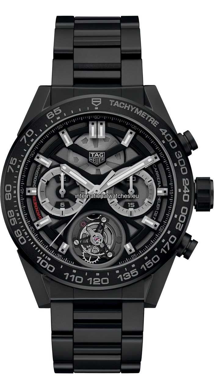 An all-ceramic edition of the flagship TAG Heuer Carrera Heuer-02 Tourbillon Chronograph. Silver-tone dial and the word “CHRONOMETER”, printed in bold red between 8 and 9 o’clock, punctuates the all-back design.