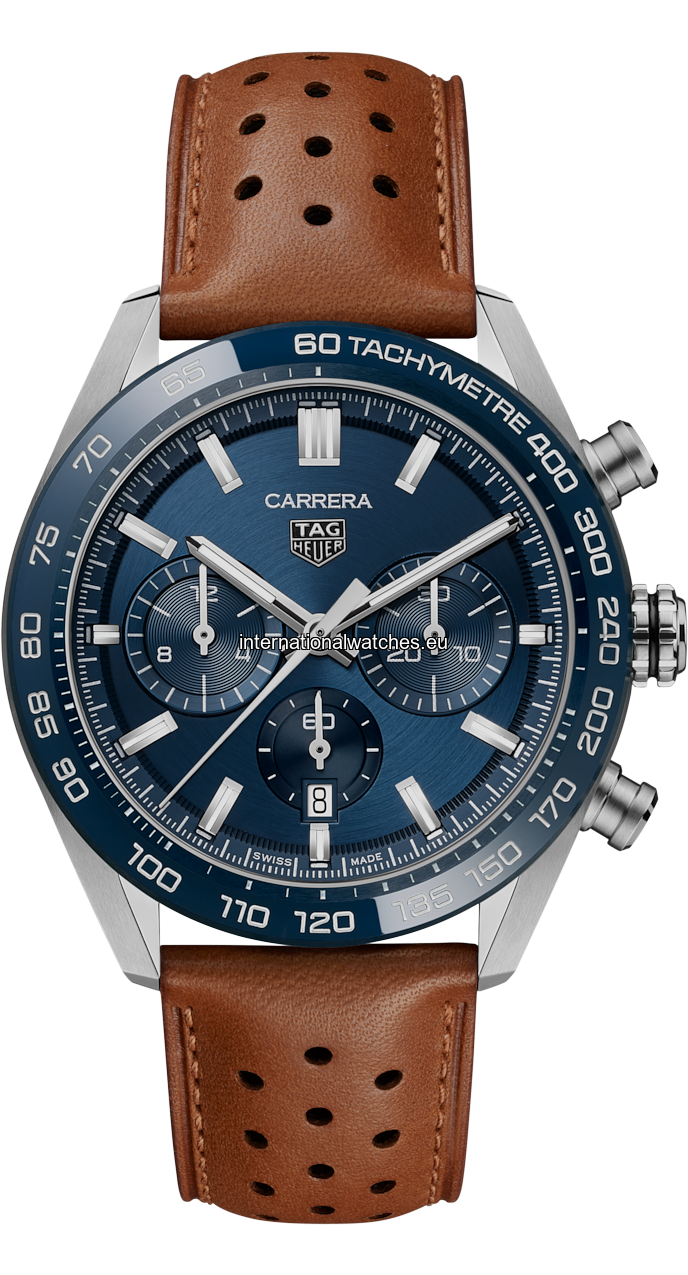 The signature design of this luxurious TAG Heuer Carrera is driven to precision, thanks to the perforated brown calfskin strap and with a blue lining matching the dial and bezel. A driven new look for an iconic chronograph.