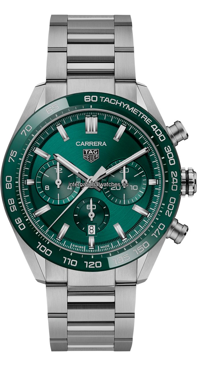 This classic TAG Heuer Carrera takes on a trendy allure with its bold green dial and matching ceramic bezel. The sporty design and monochromatic colour scheme add to the appeal of this adventure-ready timepiece, integrating the in-house Calibre Heuer 02 movement.
