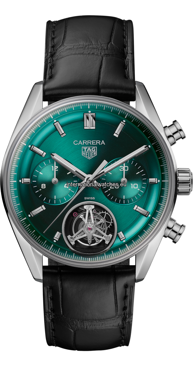 Introducing the TAG Heuer Tourbillon Chronograph in a stunning 42 mm design. The striking monochromatic teal green dial encapsulates the very essence of precision timekeeping. Paired with a black alligator leather strap, it’s set to speed ahead in style.