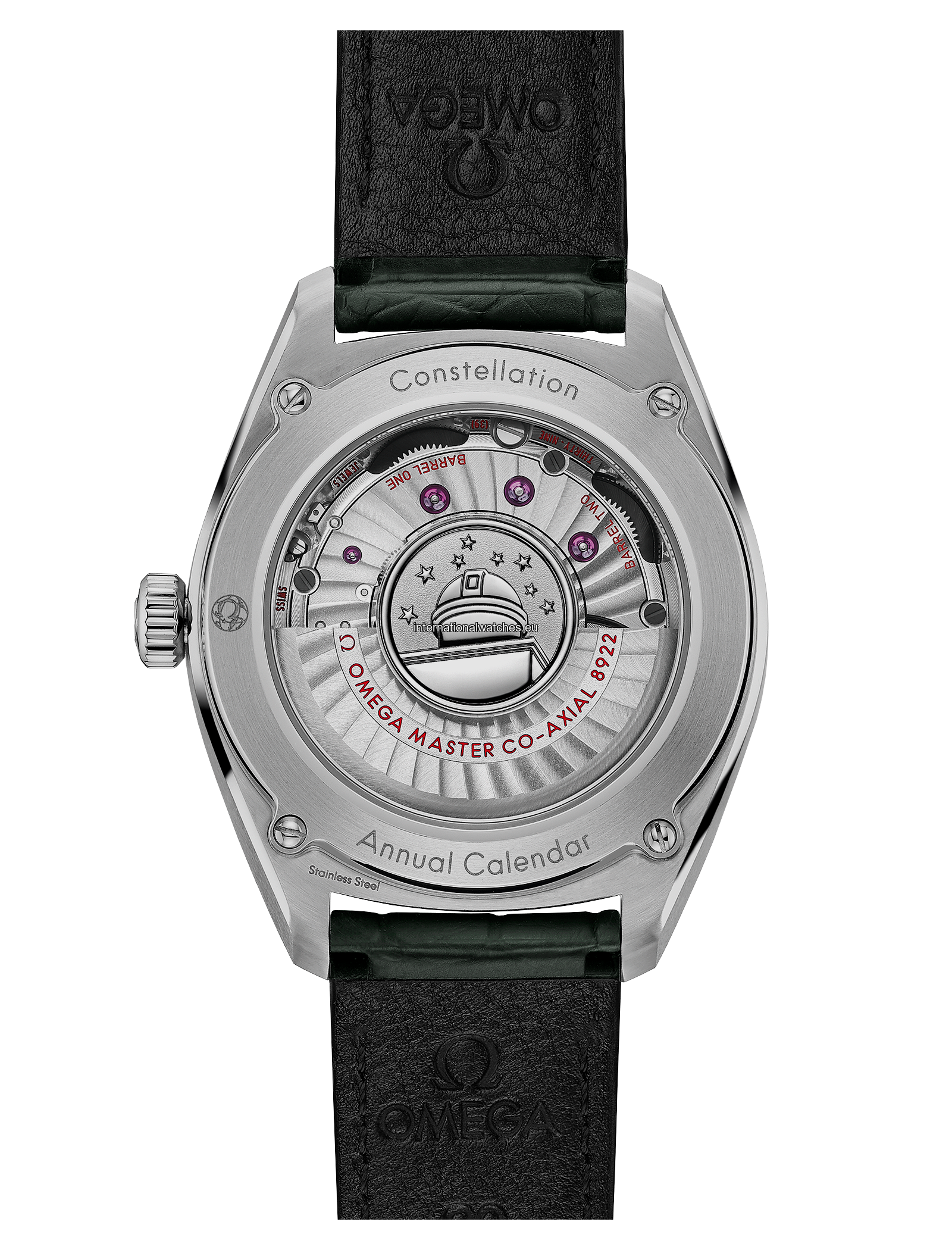 This watch has a green leather strap and is driven by OMEGA's Co-Axial Master Chronometer Annual Calendar Calibre 8922, featuring revolutionary anti-magnetic technology.