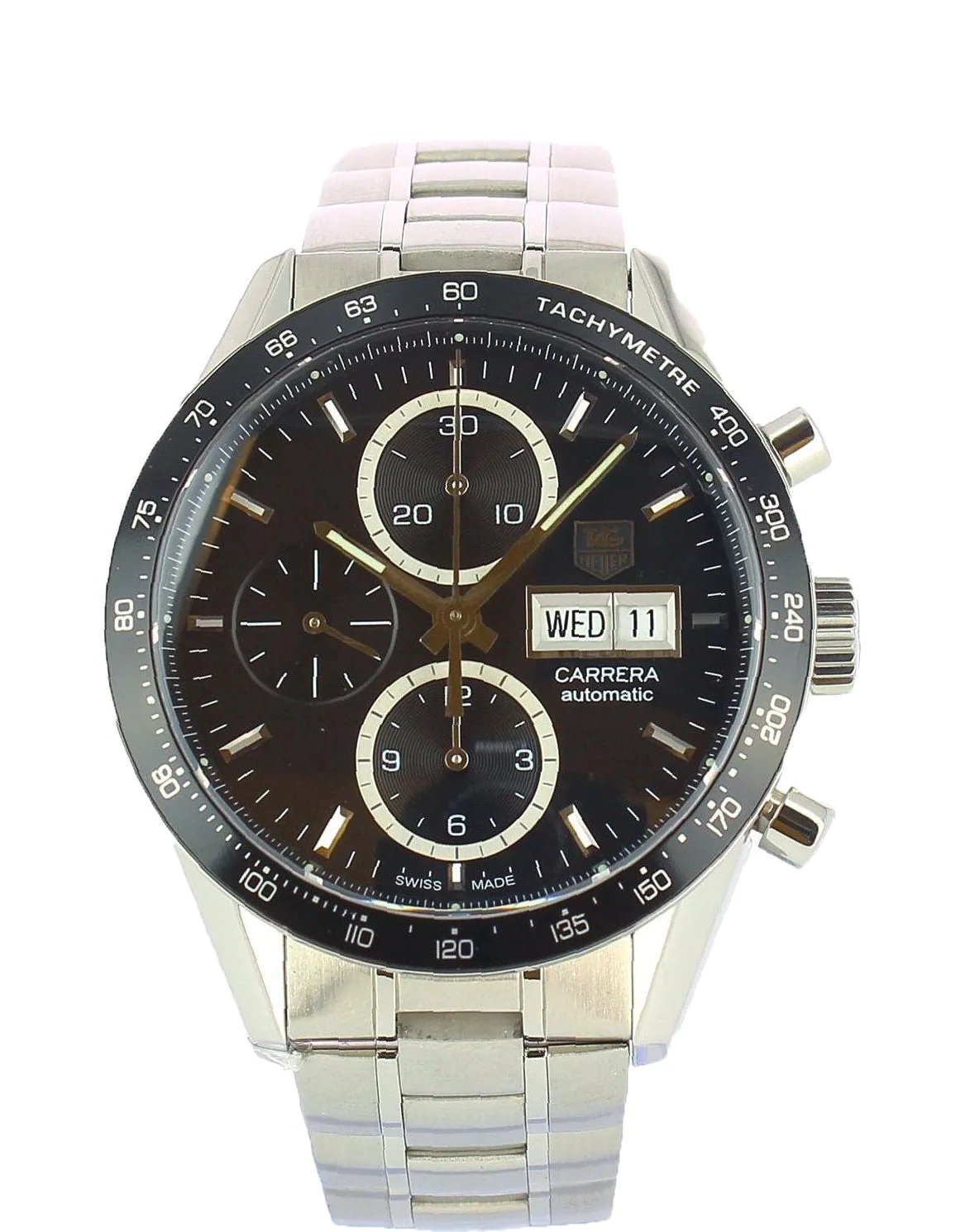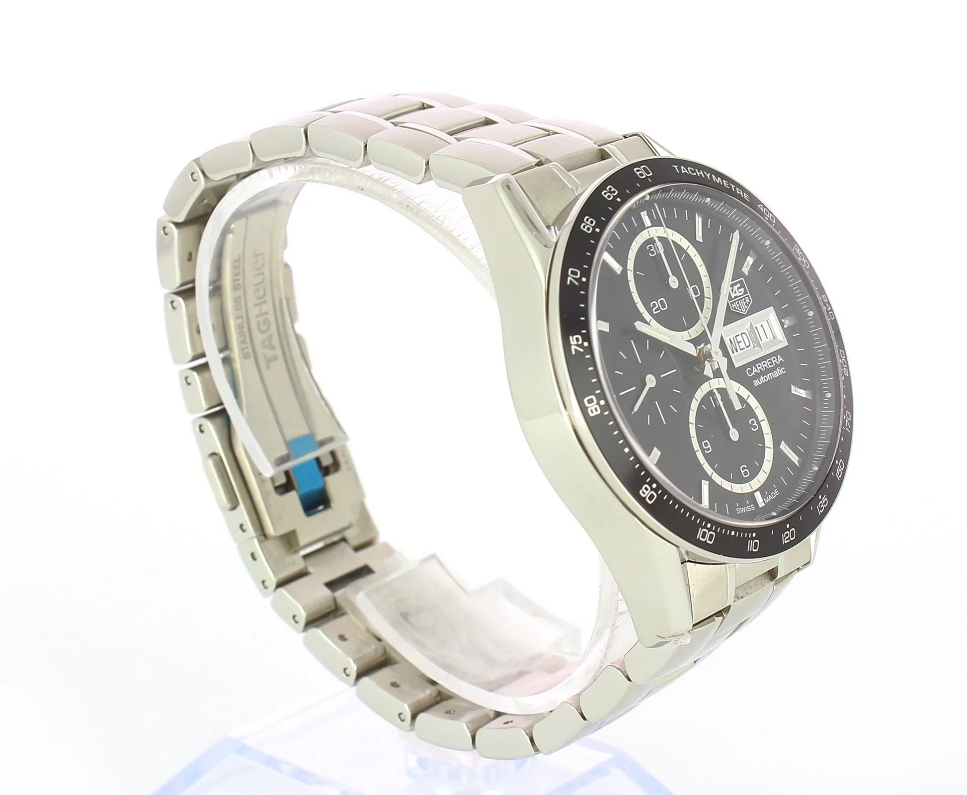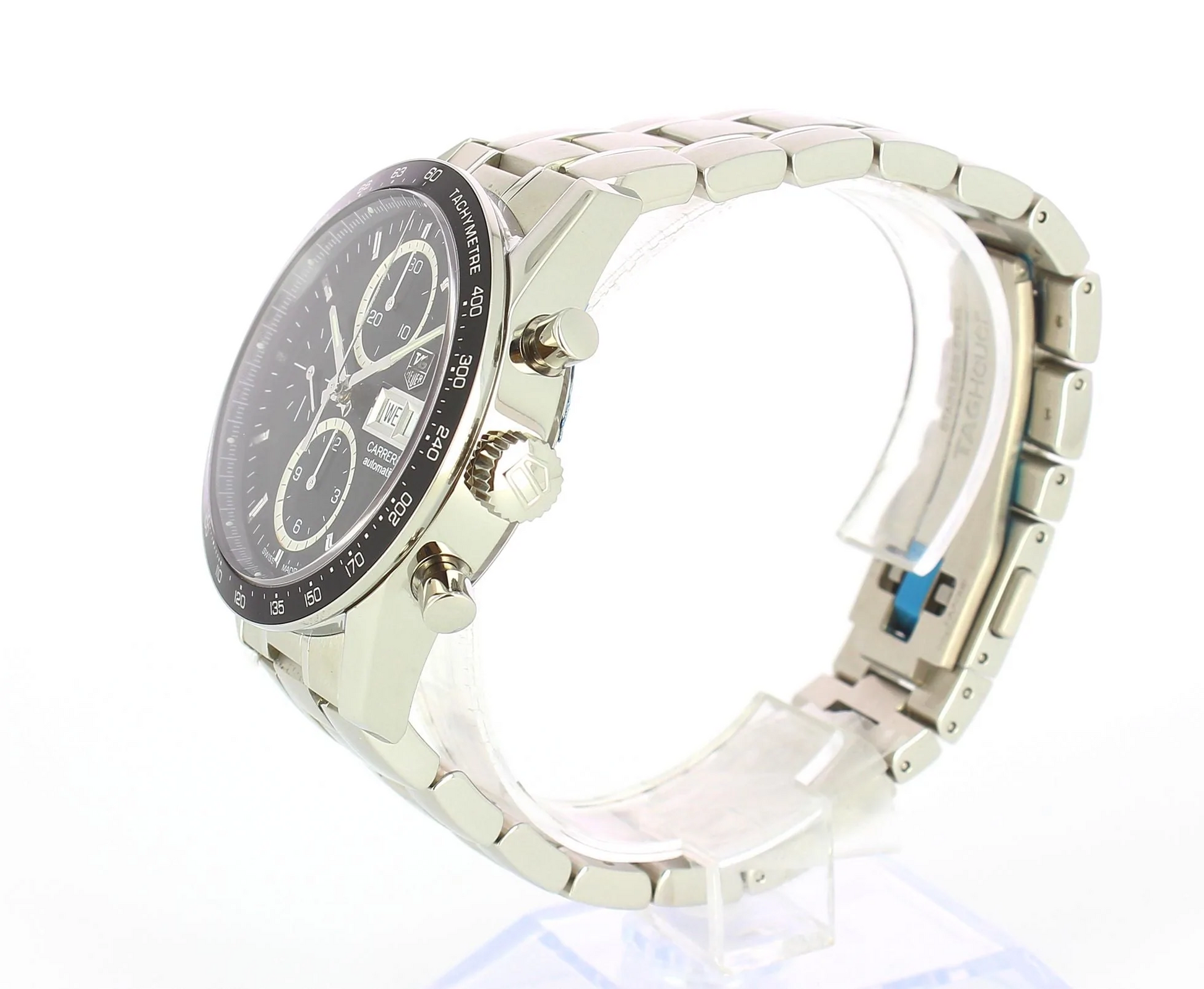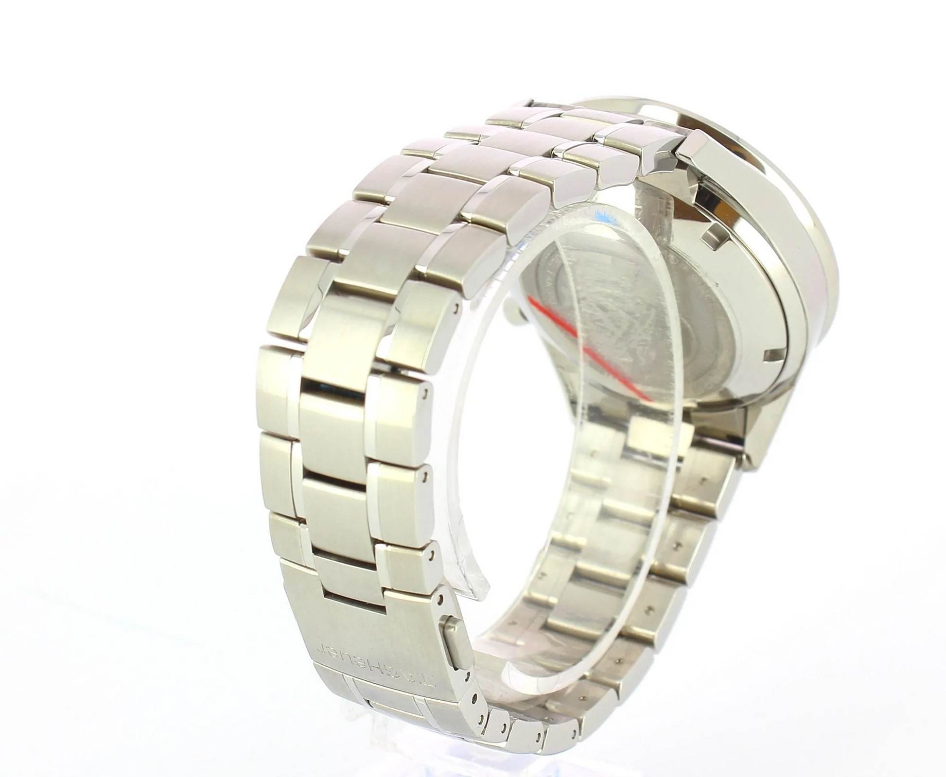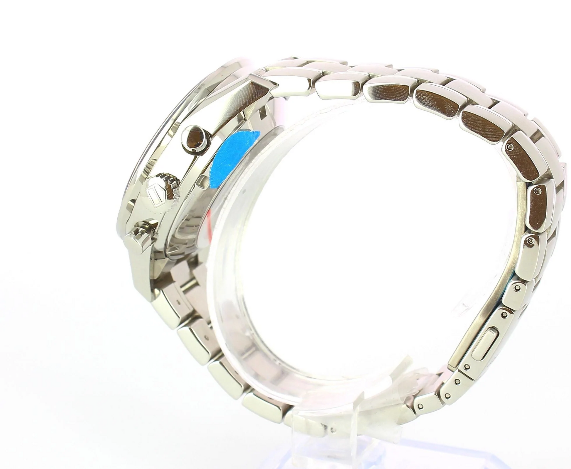 Stainless steel case with a stainless steel bracelet. Fixed black aluminium with tachymeter bezel. Black dial with luminous hands and index hour markers. Minute markers around the outer rim. Dial Type: Analog. Luminescent hands and markers. Day of the week and date display at the 3 o'clock position. Chronograph sub dials displaying: three 60 second, 30 minute and 12 hour. Automatic movement. Calibre 16 engine. Scratch resistant sapphire crystal. Pull or push crown. Solid case back. Case diameter: 42 mm. Case thickness: 17 mm. Round case shape. Fold over deployment clasp