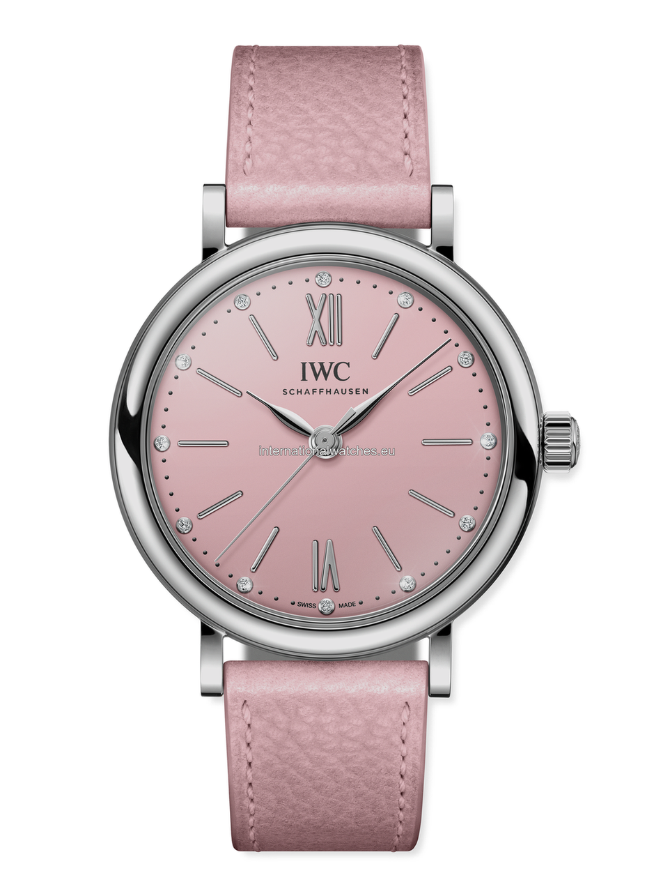 A classic round case and appliquéd Roman numerals and indices: these design cues have made the Portofino, launched in 1984, one of IWC’s most successful watch families. With its reduced diameter of 34 millimetres, the Portofino Automatic 34 fits perfectly on slender wrists. This elegant timepiece features a stainless steel case and a charming pink dial. Twelve pure white diamonds mark the hours and add a sparkle. This Portofino Automatic 34 is delivered with two straps: one grey calfskin strap and a second one in pink, matching the dial. Thanks to the integrated quick change system, the straps can be exchanged effortlessly and the timepiece adapted to different outfits or occasions in the blink of an eye.