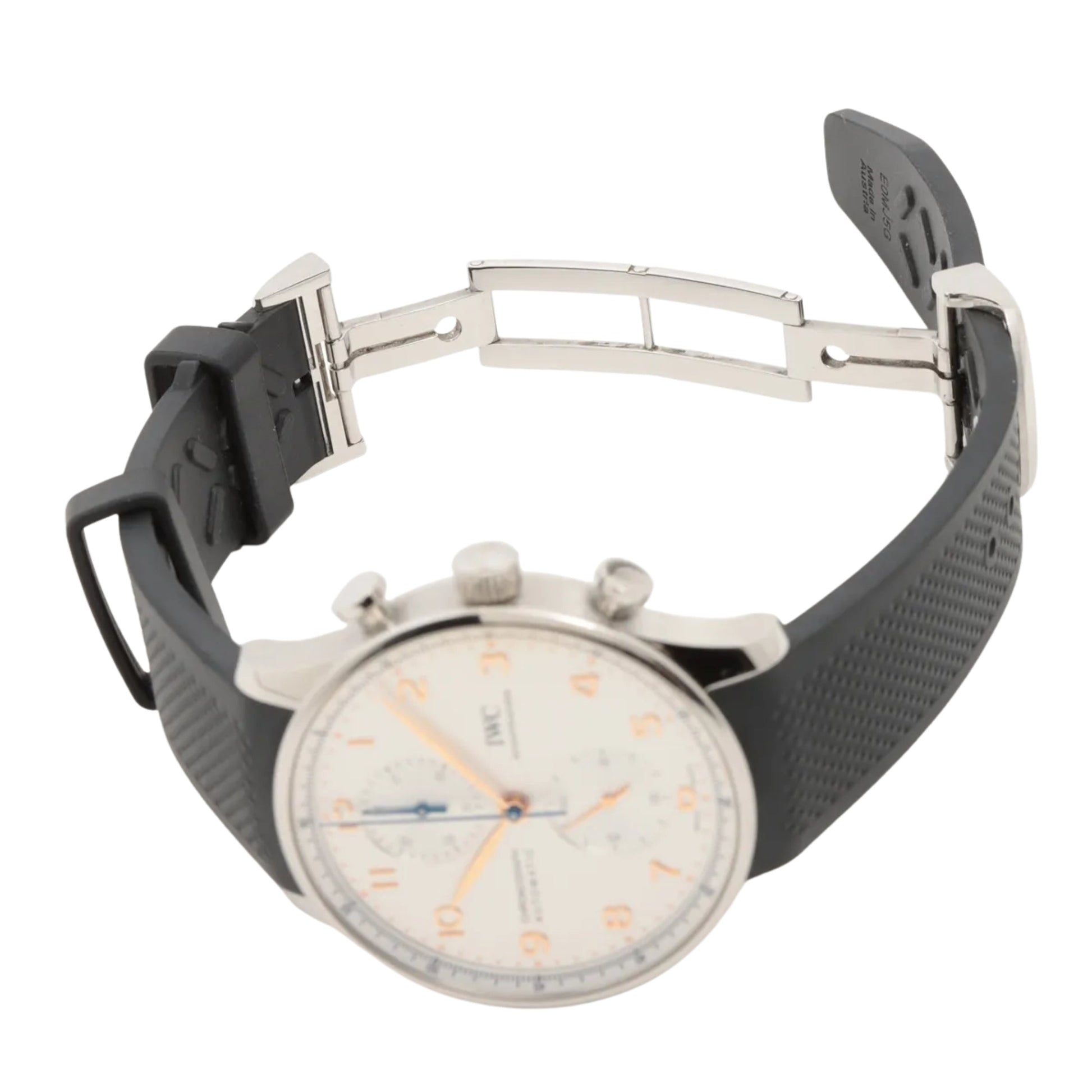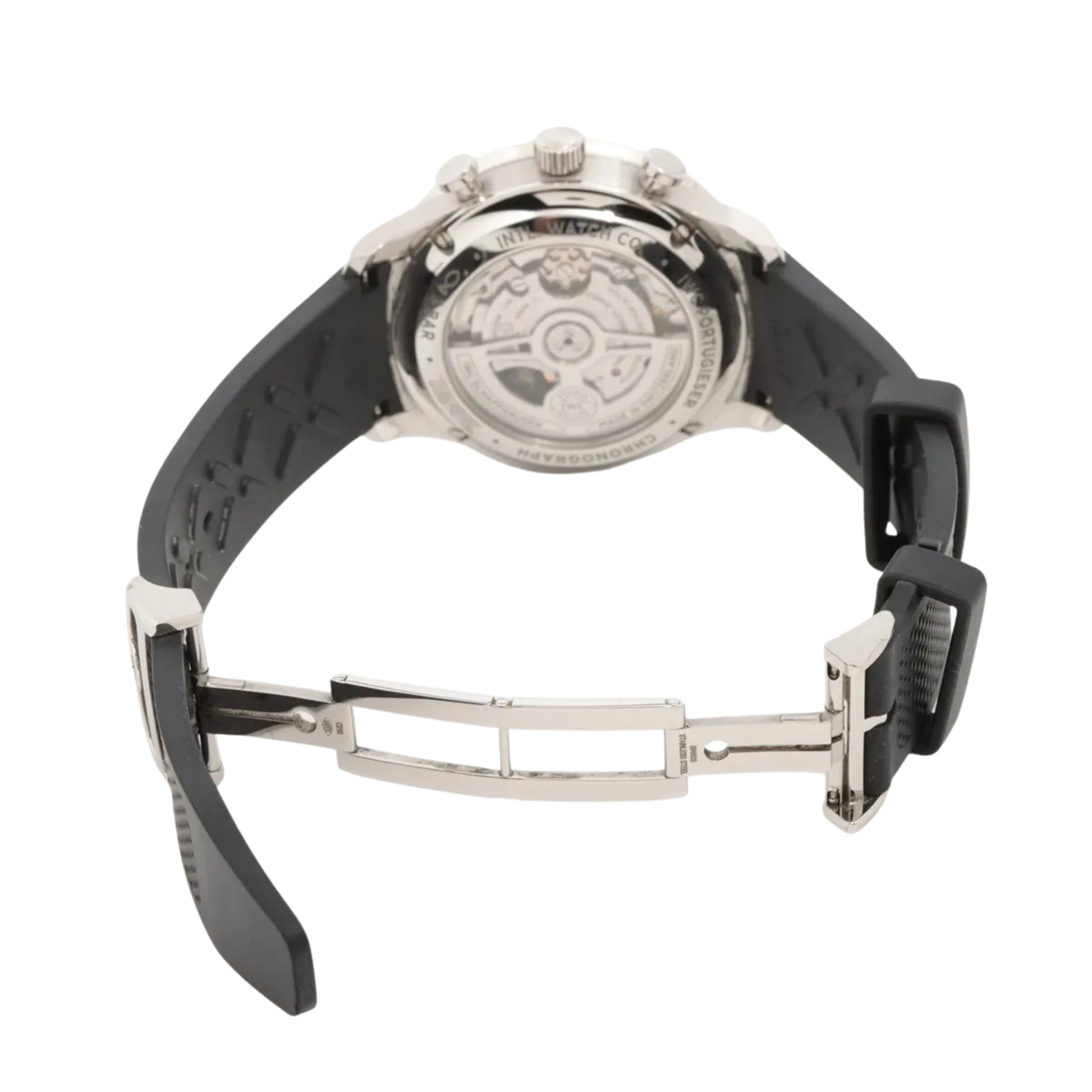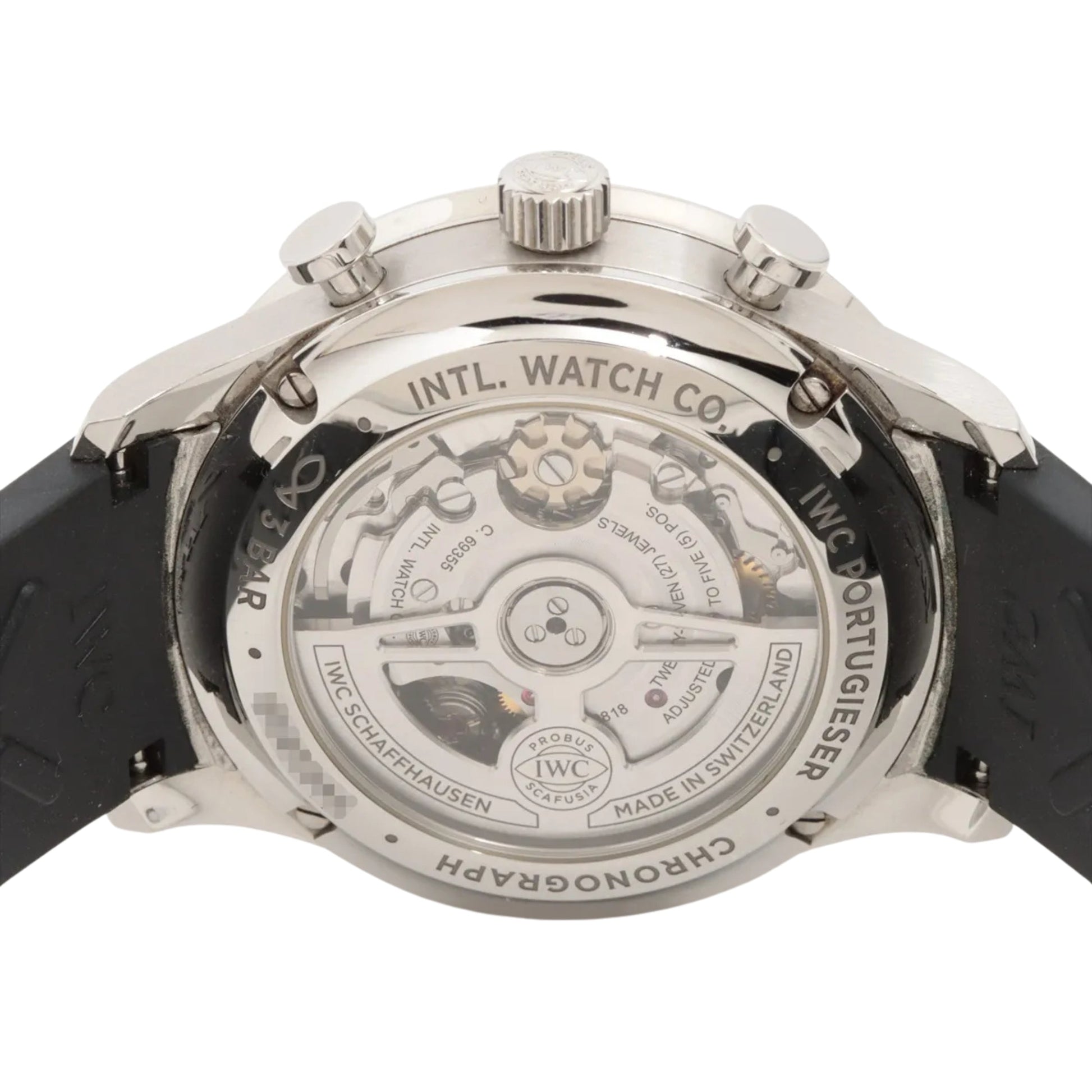 This Portugieser has a stainless steel case with a rubber strap. Transparent case back. Silver dial with arabic numeral. Chronograph with two sub-dials with 30 minutes and 60 seconds. IWC Calibre 69355 automatic movement has a power reserve of 46 hours. Ref. 371604
