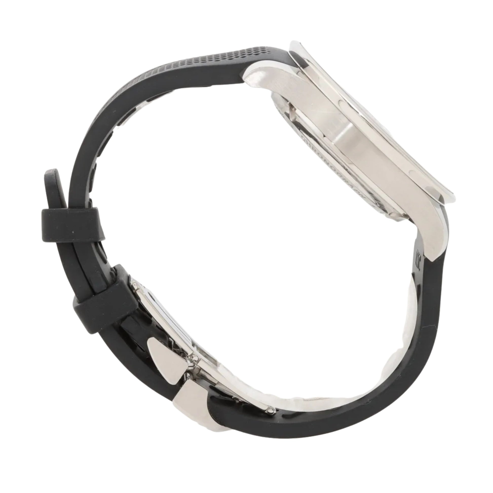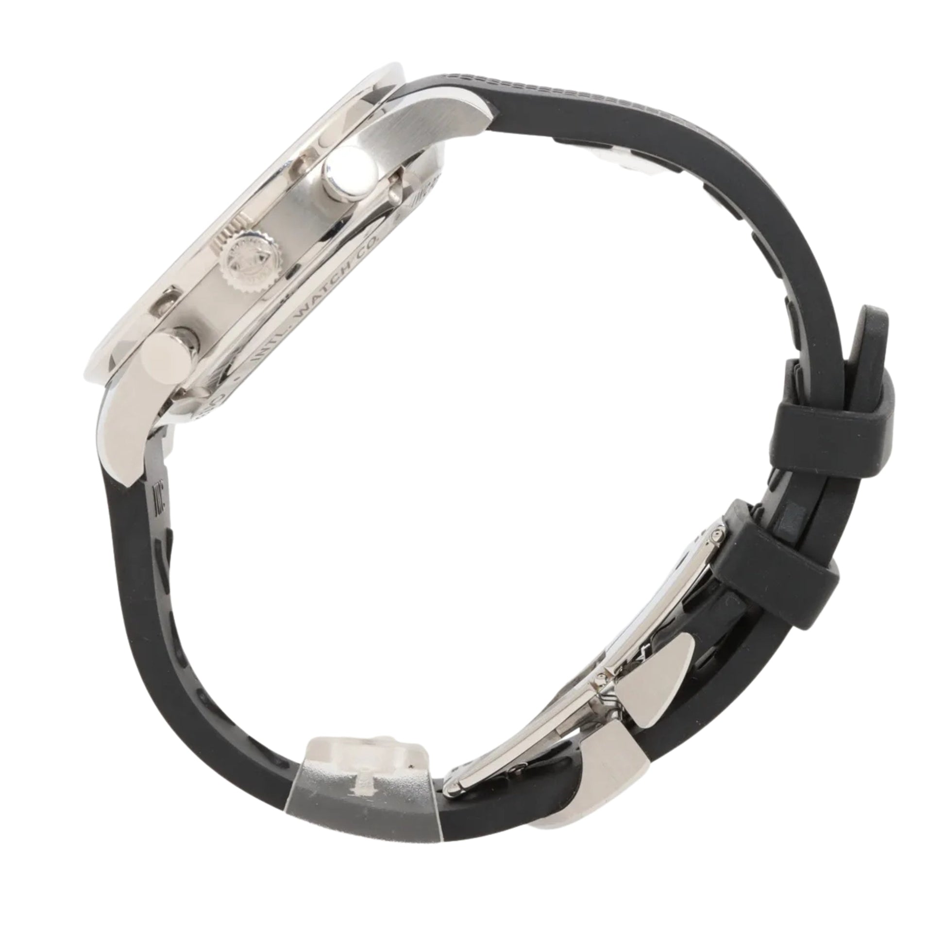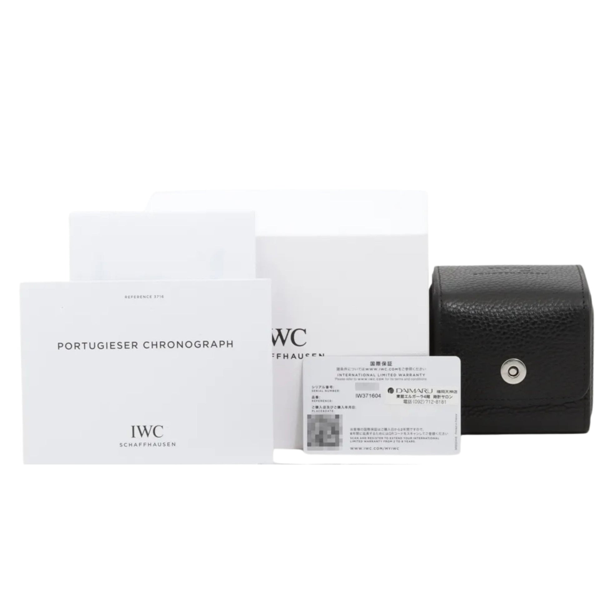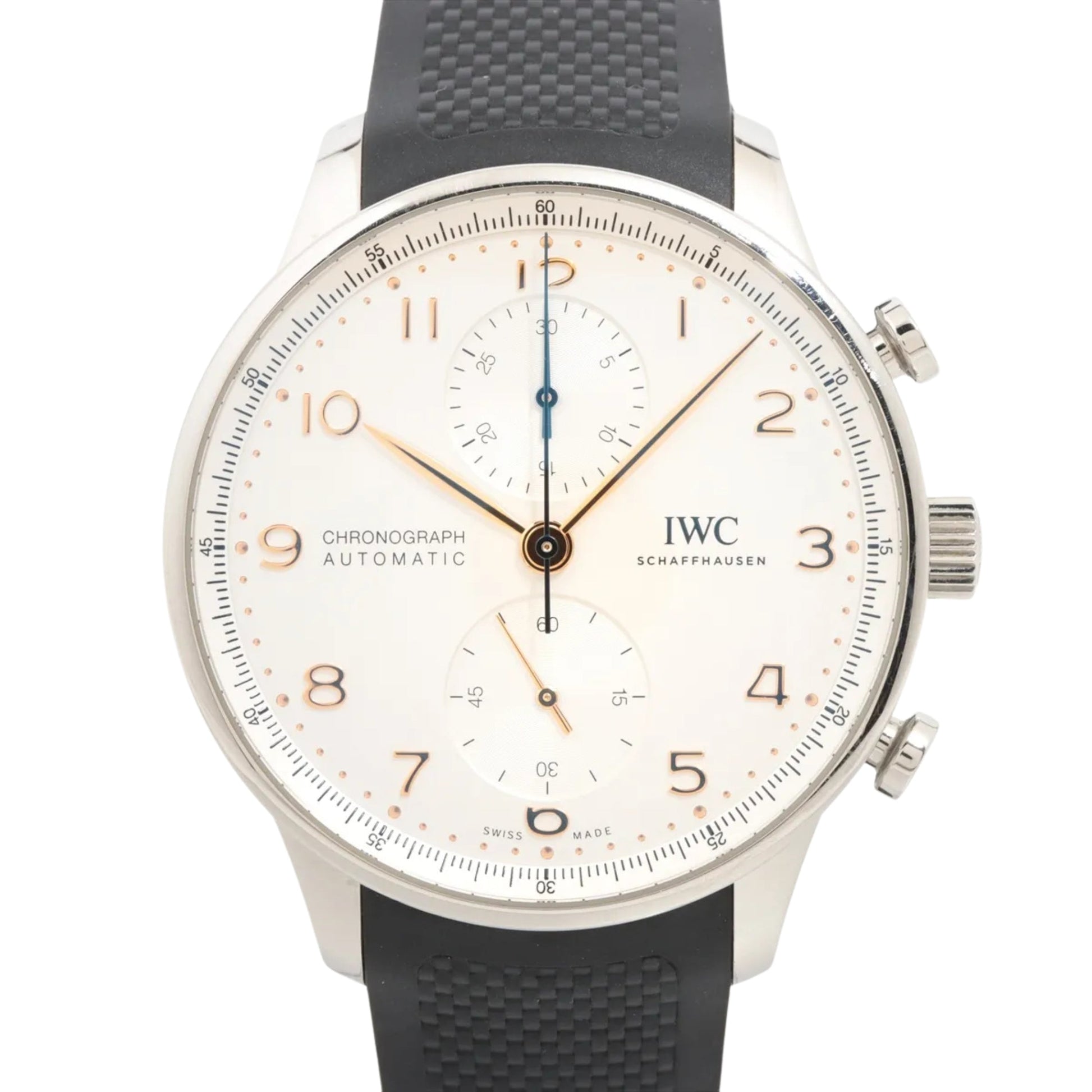 This Portugieser has a stainless steel case with a rubber strap. Transparent case back. Silver dial with arabic numeral. Chronograph with two sub-dials with 30 minutes and 60 seconds. IWC Calibre 69355 automatic movement has a power reserve of 46 hours. Ref. 371604