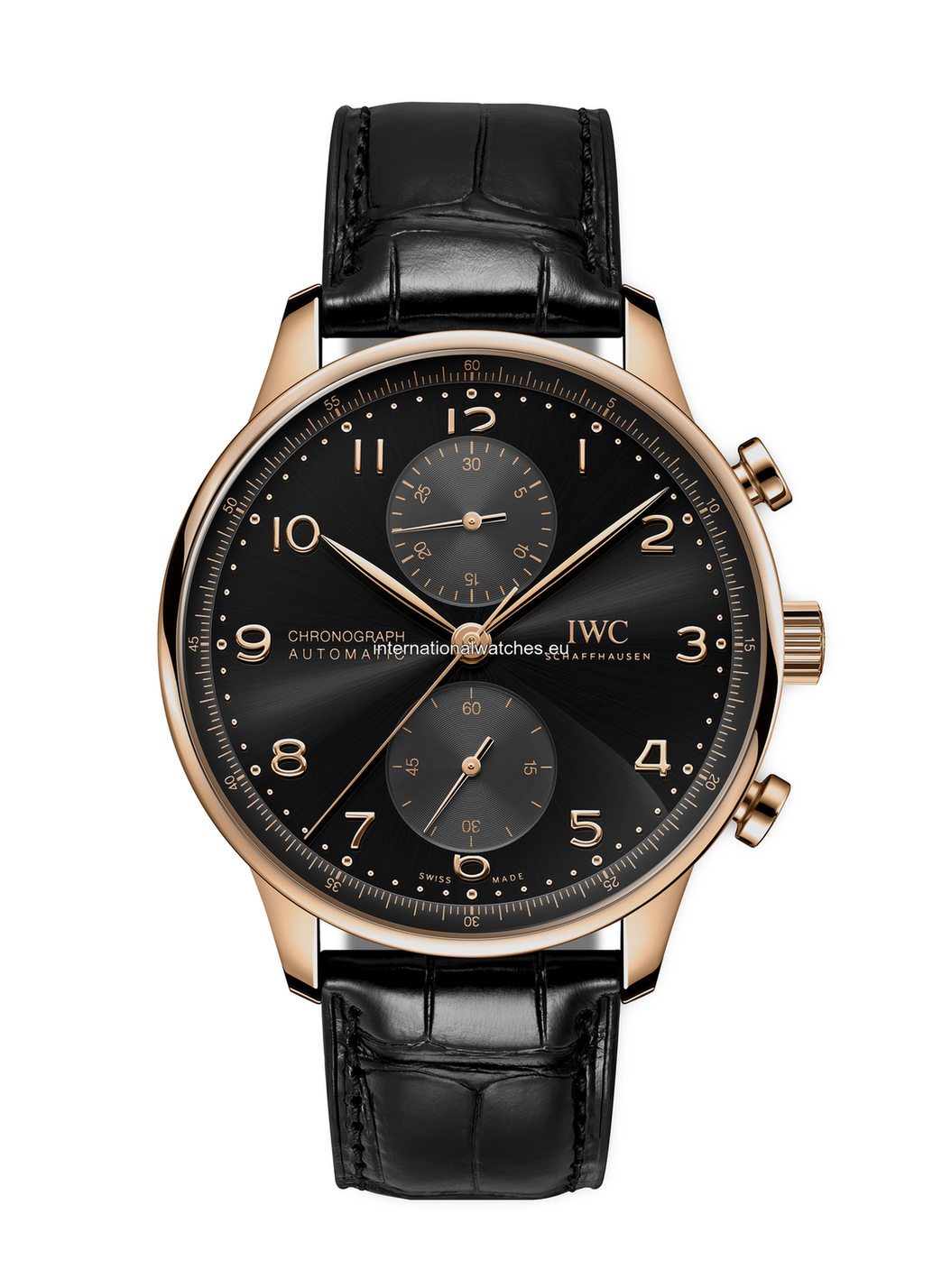 This version features a polished 18-carat 5N gold case with a diameter of 41 millimeters, an Obsidian dial, and gold-plated hands and gold appliques. A particular highlight is the intricately crafted dial, which is manufactured in a complex process comprising 60 individual steps. The unusual optical depth is created by applying 15 layers of transparent lacquer, which is fine-ground and then polished to a high gloss finish. The subdials are milled into both the brass blank and the lacquer layer. A special printing process further enhances the three-dimensional effect. Finally, the appliques are individually mounted on the dial by hand. The Portugieser Chronograph is powered by the IWC-manufactured 69355 caliber, a mechanical chronograph movement engineered with an uncompromising focus on robustness, reliability, and longevity. The watch is fitted with a black alligator leather strap from Santoni with an 18-carat 5N gold pin buckle.