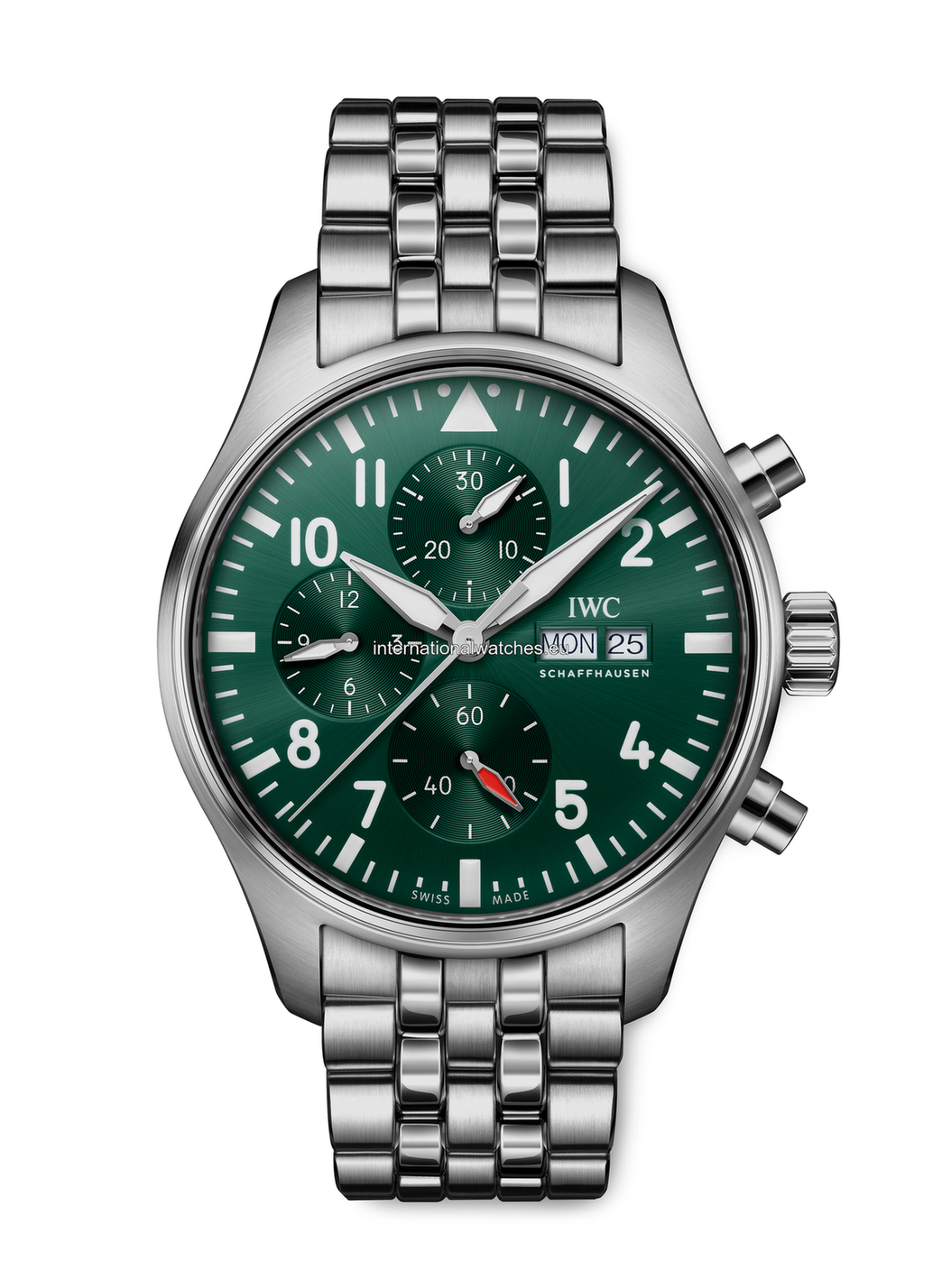 Chronographs have formed an integral part of IWC Schaffhausen’s Pilot’s Watches collection since 1994. This Pilot’s Watch Chronograph features a stainless steel case with a diameter of 43 millimeters, a green dial, and rhodium-plated hands. The high-contrast dial with large Arabic numerals and the triangle index marker at 12 o’clock has been designed in the style of an easy-to-read cockpit instrument. Thanks to luminescent elements, the time can be read at a glance, even at night, or in difficult visibility conditions. The IWC-manufactured 69385 caliber, a precise and robust chronograph movement in classic column-wheel design, enables measurement of stop or aggregate times of up to 12 hours. The hours are displayed on the counter at 9 o’clock, the minutes at 12 o’clock. The small second features a red hand and is located at 6 o’clock. The self-winding movement with a power reserve of 46 hours is visible through the sapphire glass back. Water-resistant to 10 bar, the chronograph is fitted on a 5-link stainless steel bracelet with a folding clasp. Thanks to the integrated EasX-CHANGE® system, the strap can be easily changed without additional tools.