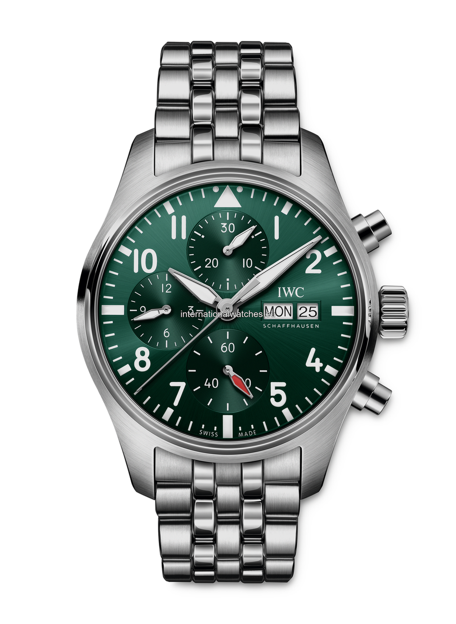 Since 1994, chronographs have been a mainstay in IWC’s Pilot’s Watches collection. The dial layout with various counters not only emphasises the distinctive instrument look; the mechanical stopwatch function also offers virtually unlimited applications in everyday life. The Pilot’s Watch Chronograph 41 in an ergonomic 41-millimetre case size is powered by the IWC-manufactured 69385 calibre. The robust and precise chronograph movement with a column wheel can be observed through the sapphire glass back. This stainless steel model comes with a green dial, rhodium-plated hands and a high-quality stainless steel bracelet with fine adjustment system and a tapered shape. The integrated EasX-CHANGE system allows the strap to be changed in no time at all. Also available are calfskin or rubber straps in various colours. In combination with the 10 bar water-resistant case, this versatility makes the chronograph the perfect companion for every adventure – not just in the cockpit.