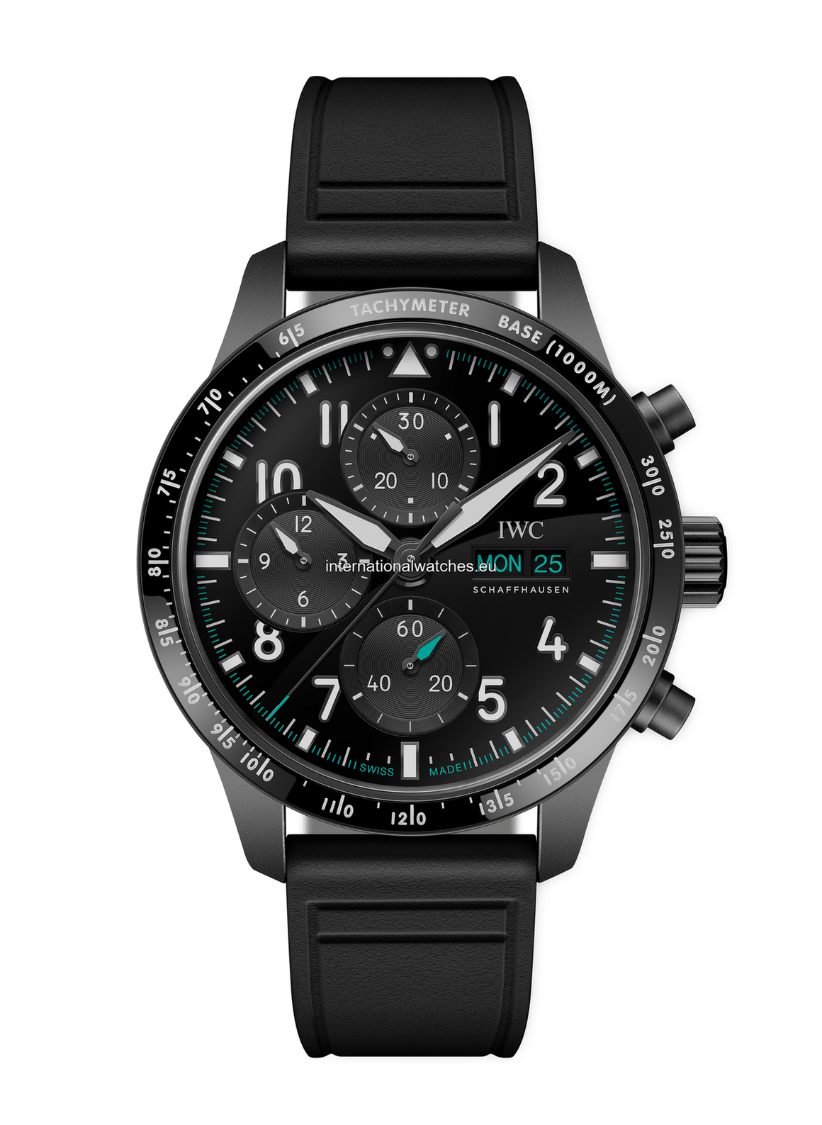 Performance aspects such as high robustness, easy readability and maximum precision are deeply rooted in IWC's DNA as a watch manufacturer. With the Pilot's Watch Performance Chronograph, the company presents a chronograph that has been uncompromisingly optimised for performance. This version is dedicated to the Mercedes-AMG PETRONAS Formula One™ Team. IWC has been the “Official Engineering Partner” of the team since 2013. The 41-millimetre case and the case back ring are made of Ceratanium®. Developed by IWC, this lightweight material is based on a special titanium alloy and combines the lightness and structural integrity of titanium with a hardness and scratch-resistance similar to ceramic. An outstanding functional feature of the watch is the ceramic bezel with a tachymeter scale, which allows the wearer to measure the average speed in relation to the distance travelled. Matching the polished black ceramic bezel, the model features a black dial with a glossy finish. The recessed totalizers, the hands and the applied indices and numerals in blackened nickel, filled with Super-LumiNova®, provide additional depth and ensure excellent night-time readability. The Pilot’s Watch Performance Chronograph 41 is powered by the IWC-manufactured 69385 calibre. This mechanical chronograph movement consists of 242 individual parts and is visible through a tinted sapphire glass case back. Its bi-directional pawl winding system builds up a power reserve of 46 hours in the mainspring. Column-wheel control of the chronograph ensures that individual phases in the switching sequence are clearly defined. There is also a distinct tactile resistance when the buttons are pushed. The chronograph features the IWC-typical vertical subdial layout. The stopped minutes are displayed directly at the 12 o’clock position, enhancing readability. Water-resistant to 10 bar, the watch with a durable and waterproof black rubber strap with a Ceratanium® pin buckle.