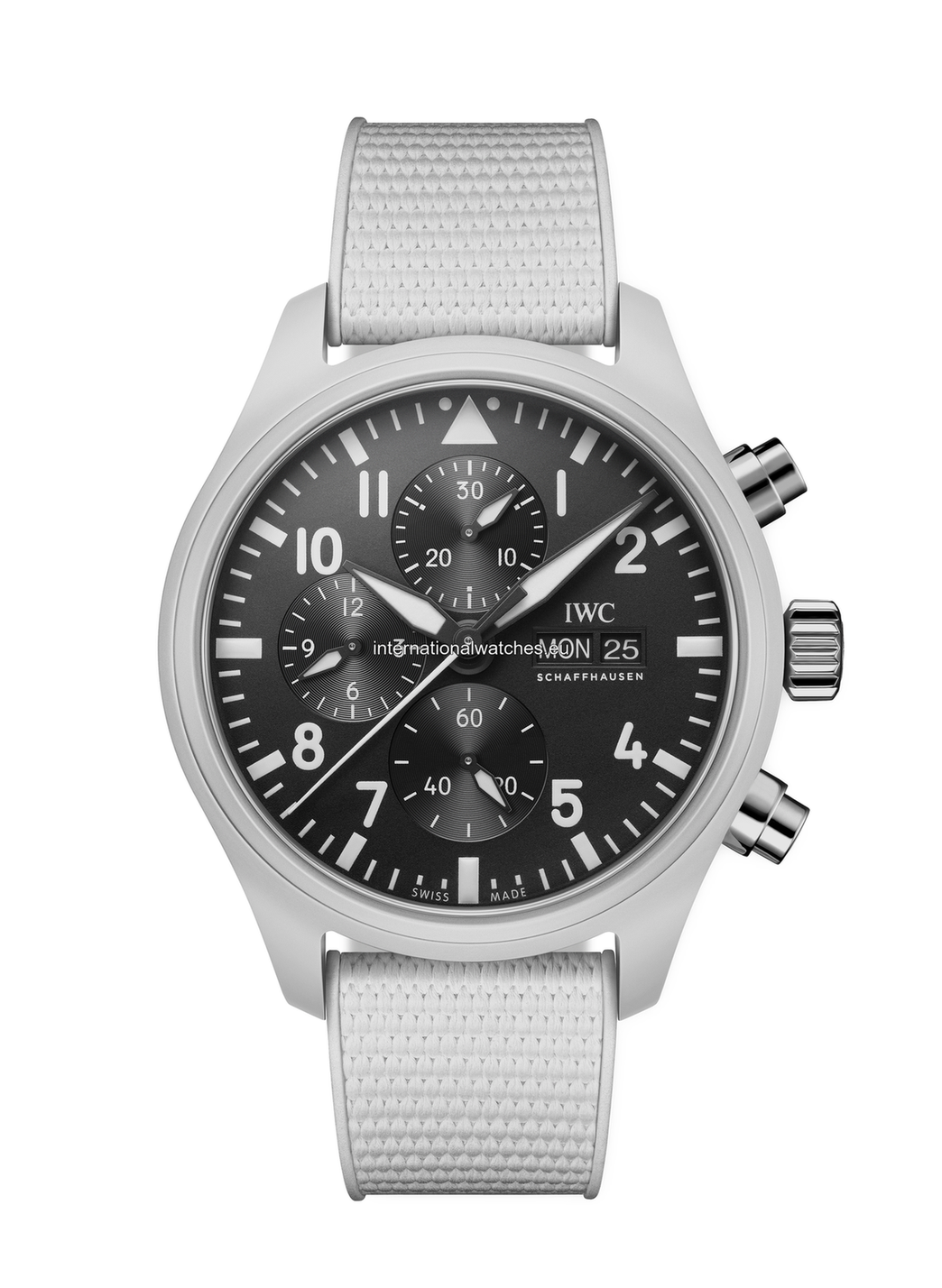 A subdued white with a mysterious shimmer: the ceramic color “Lake Tahoe” is inspired by the “Service Dress White” uniform of the US Navy, but also by the contrasting winter landscape with the snow-covered peaks around the largest freshwater lake in the Sierra Nevada. The elite pilots from the TOP GUN flight school often fly over this mountainous landscape. White ceramic is emblematic of IWC's comprehensive ceramic expertise. The brand experimented with this colour as early as during the 1980s. The striking white ceramic case of the Pilot’s Watch Chronograph TOP GUN Edition “Lake Tahoe” is combined with a black dial and black hands, as well as white print and luminescence. The case back featuring the TOP GUN logo is made of titanium, while the pushers and crown are made of stainless steel. Inside the ceramic case with a diameter of 44 millimetres, the IWC-manufacture 69380 calibre is at work. Featuring a classic column-wheel design, the chronograph also features a day and date display at 3 o’clock. A soft-iron inner case shields the movement from the effects of magnetic fields. This TOP GUN chronograph is fitted on a white rubber strap with a distinctive embossing, whose color has been perfectly matched to the “Lake Tahoe” case.