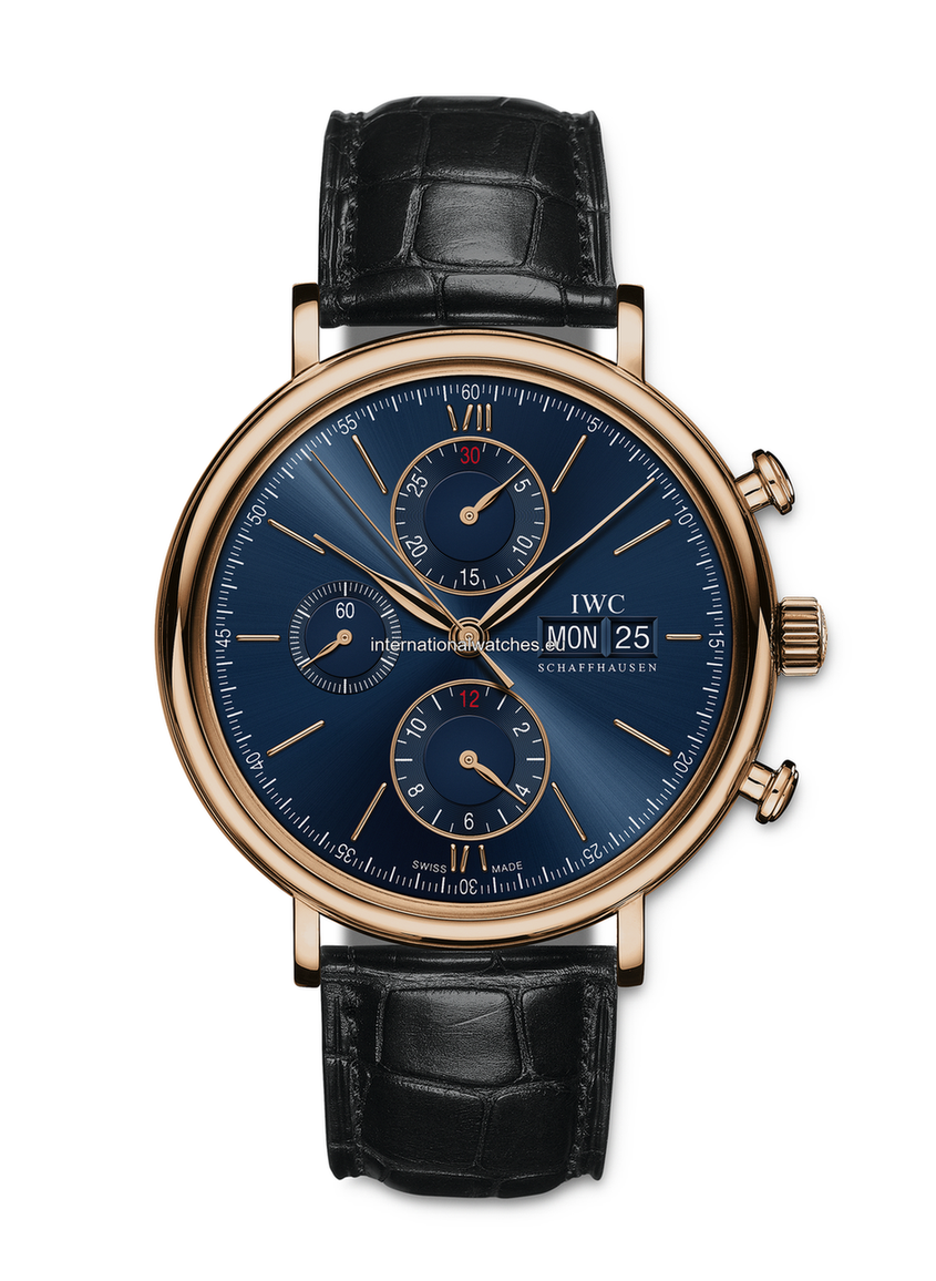 The Portofino family successfully combines the ease of the Mediterranean lifestyle with understated glamour and timeless elegance. Since 1988, chronographs have had their firm place in this family. The Portofino Chronograph handles single stop times and aggregate timing up to 12 hours, bringing a sporty touch to the collection. Now, for the first time, this popular model is offered with a case made of precious 18-carat 5N gold and a blue dial. The applied indices and Roman numerals are made from solid gold, the slender feuille hands are gold-plated. This watch is fitted with a hand-painted black alligator leather strap.