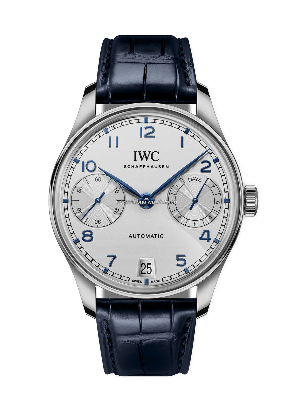 This version features a stainless steel case with a diameter of 42.4 millimeters, a silver-plated dial, and blue hands and appliques. The watch appears elegant and refined thanks to a thoroughly reworked case construction with a thinner casing ring and box-glass sapphire crystals on the front and the back. A highlight is the intricately crafted dial, which is manufactured in a complex process comprising 60 individual steps. The unusual optical depth is created by applying 15 layers of transparent lacquer, which is fine-ground and then polished to a high gloss finish. The subdials are milled into both the brass blank and the lacquer layer. A special printing process further enhances the three-dimensional effect. Finally, the appliques are individually mounted on the dial by hand. The Portugieser Automatic 42 is powered by the IWC-manufactured 52011 caliber, which is elaborately finished with circular graining and Geneva stripes. The Pellaton winding system is reinforced with virtually wear-free zirconium oxide ceramic components and builds up a power reserve of seven days (168 hours) in two barrels. The watch is fitted with a blue alligator leather strap with a stainless steel folding clasp.