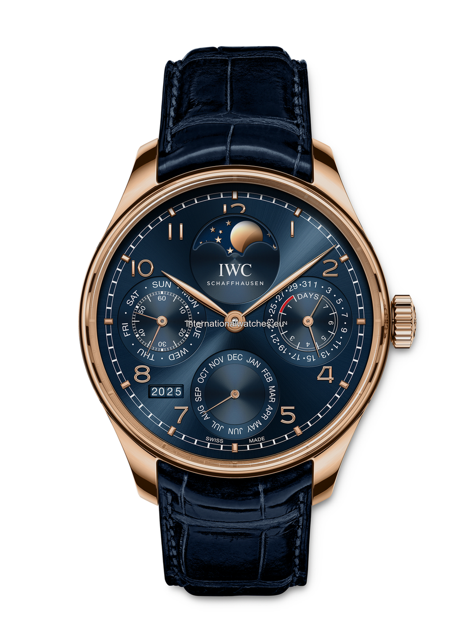 IWC’s perpetual calendar, developed by Kurt Klaus in the 1980s, automatically recognizes the different lengths of the months and the leap years. It can be easily adjusted using the crown. The mechanical program will not require any manual correction until 2100. The Portugieser Perpetual Calendar displays the calendar information on four sub-dials. In addition to the displays for the date, the weekday, the month and the moon phase, it features a four-digit year indication and a power reserve display. This special edition is characterized by a maritime design and is available exclusively at IWC boutiques and online at iwc.com. It features an 18-carat Armor Gold® case, a blue dial, gold-plated hands and 18-carat gold appliqués. The IWC-manufactured 52610 calibre’s Pellaton winding system is fitted with ceramic components and builds up a power reserve of 7 days in two barrels. The decorated movement and the rotor in 18-carat gold are visible through the sapphire glass case back.