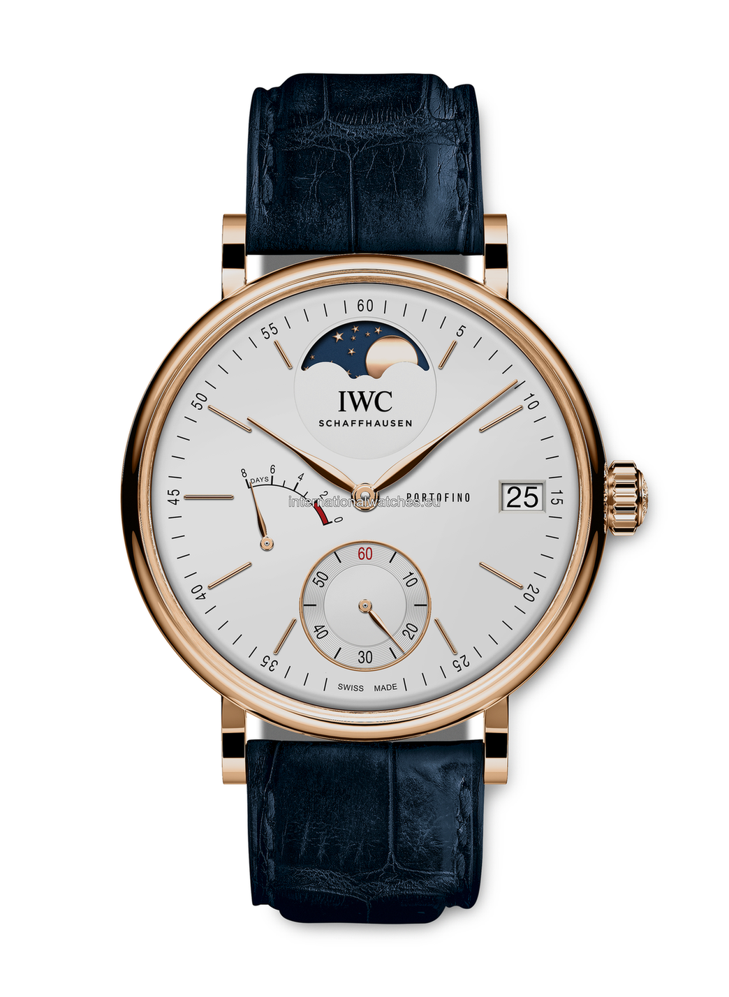 In 1984, IWC created the Portofino collection. The family was named after the idyllic village on the Italian coast, which became an exclusive holiday destination for the international jet-set during the 1950s and 1960s. Since that day, Portofino watches have successfully combined the ease of the Mediterranean lifestyle with a touch of glamour and elegance. The Portofino Hand-Wound Moon Phase pays homage to the first Portofino from 1984, which also featured a moon phase display. Now, this coveted model is available in 18-carat 5N gold case with a silver-plated dial as well as gold-plated hands and solid gold appliqués for the first time. The exclusive timepiece is powered by the IWC-manufactured hand-wound 59800 calibre, which offers a power reserve of 8 days when fully wound. This simple yet elegant watch is fitted with a hand-painted blue alligator leather strap by the Italian shoe manufacturer Santoni.