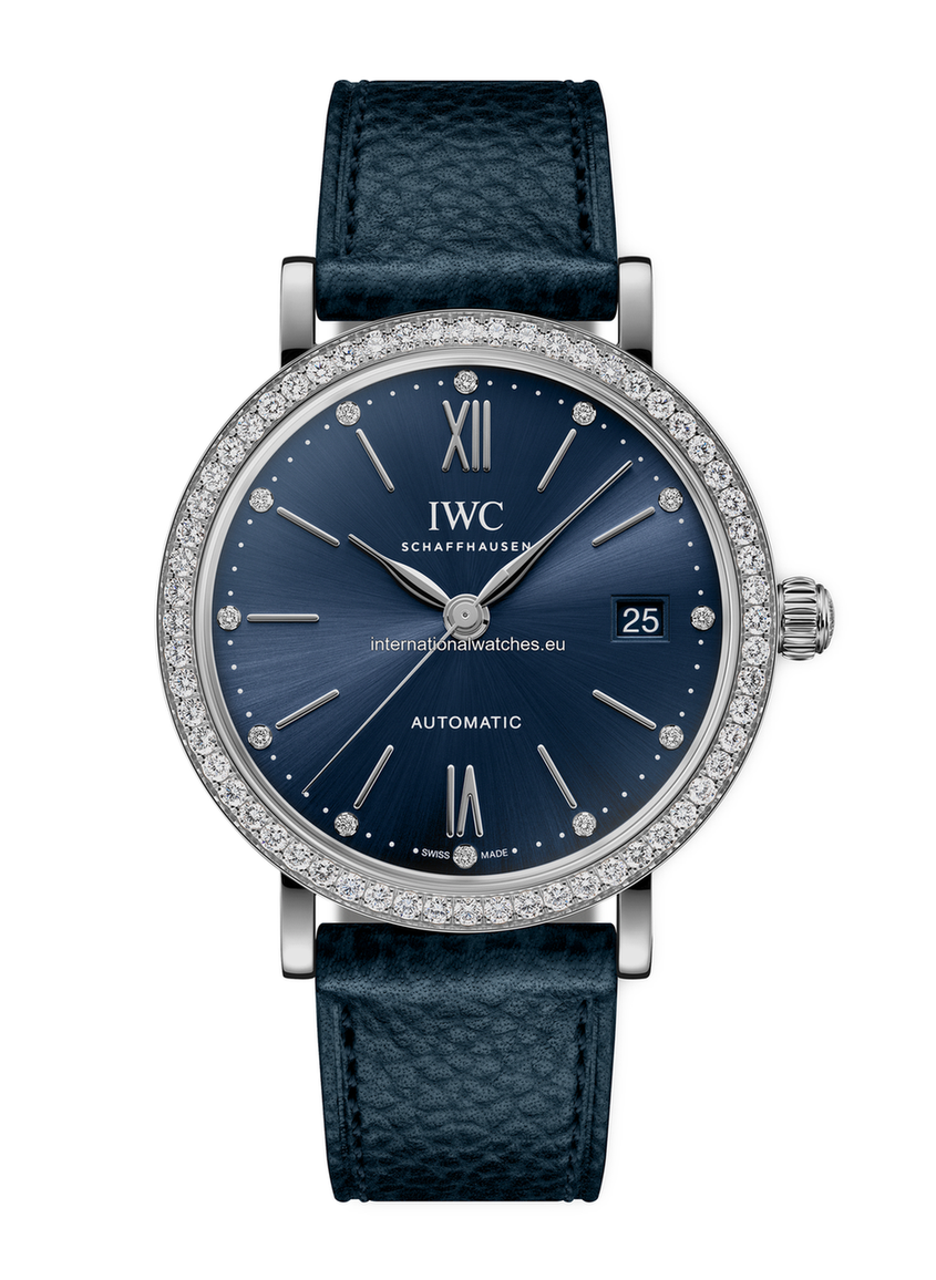 With its reduced case diameter of 37 millimetres, the Portofino Automatic 37 has become a staple in IWC’s ladies’ watches portfolio, offering excellent wearing comfort on more slender wrists. The version features a stainless steel case, a blue dial, and rhodium-plated hands and appliques. The case and the dial are decorated with 72 diamonds weighing 1.12 carats. Because of an improved setting, the diamonds reflect the light better and have a more visible presence and added brilliance. At work inside is the IWC-manufactured 32111 calibre automatic movement, which uses a bidirectional pawl winding system to build up a power reserve of 120 hours. A see-through sapphire glass back displays the movement, which has been finished with a gold-plated rotor and blued screws. This ladies’ watch is fitted with a blue strap made of fully traceable Swiss calf leather. The strap has a natural and soft finish and boasts a contemporary, luxurious feel. Thanks to the integrated quick-change system, the strap can be exchanged easily.