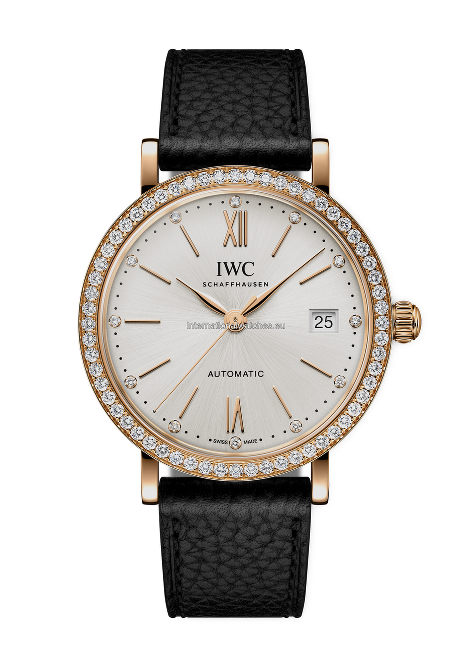 With its reduced case diameter of 37 millimetres, the Portofino Automatic 37 has become a staple in IWC’s ladies’ watches portfolio, offering excellent wearing comfort on more slender wrists. The version features a case made of 18-carat 5N gold, a silver-plated dial, and gold-plated hands and appliques. The case and the dial are decorated with 72 diamonds weighing 1.12 carats. Because of an improved setting, the diamonds reflect the light better and have a more visible presence and added brilliance. At work inside is the IWC-manufactured 32111 calibre, which uses a bidirectional pawl winding system to build up a power reserve of 120 hours. A see-through sapphire glass back displays the movement, which has been finished with a gold-plated rotor and blued screws. This ladies’ watch is fitted with a black strap made of fully traceable Swiss calf leather. The strap has a natural and soft finish and boasts a contemporary, luxurious feel. Thanks to the integrated quick-change system, the strap can be exchanged easily.