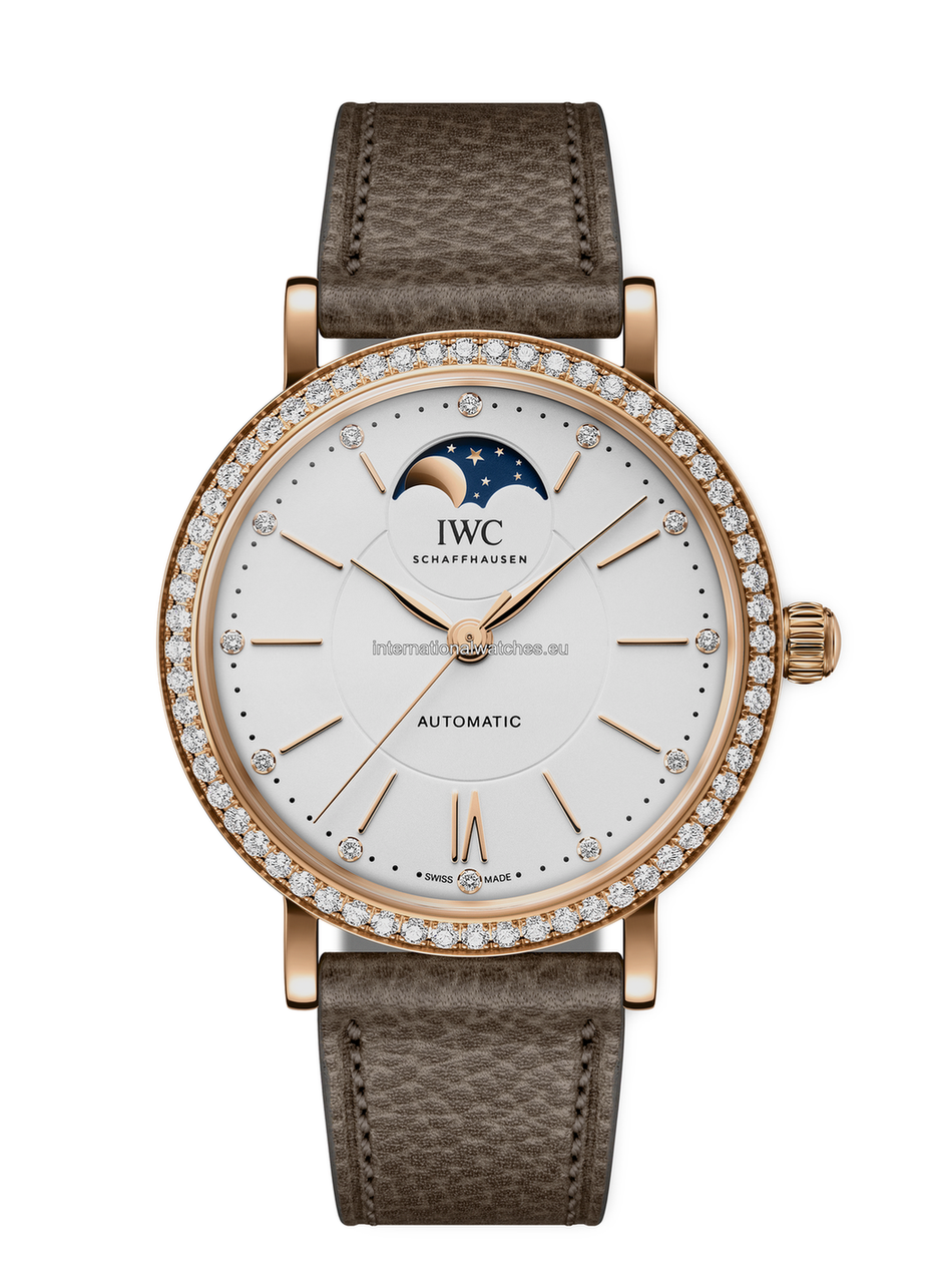 With its reduced case diameter of 37 millimetres, the Portofino Automatic 37 has become a staple in IWC’s women’s watches portfolio, offering excellent wearing comfort on more slender wrists. The Portofino Automatic Moon Phase 37 features a case made of 18-carat 5N gold, a silver-plated dial, and gold-plated hands and appliqués. The case and the dial are decorated with 72 diamonds weighing 1.12 carats. Because of an improved setting, the diamonds reflect the light better and have a more visible presence and added brilliance. For the IWC-manufactured 32800 calibre, IWC has integrated a moon phase module into a movement from the 32000 caliber family for the first time. The moon phase display at 12 o’clock works so precisely that it only deviated from the actual orbit of Earth’s satellite by one day after 122 years. A see-through sapphire glass back displays the movement, which has been finished with a gold-plated rotor and blued screws. This ladies’ watch is fitted with a taupe strap made of fully traceable Swiss calf leather. The strap has a natural and soft finish and boasts a contemporary, luxurious feel. Thanks to the integrated quick-change system, the strap can be exchanged easily.