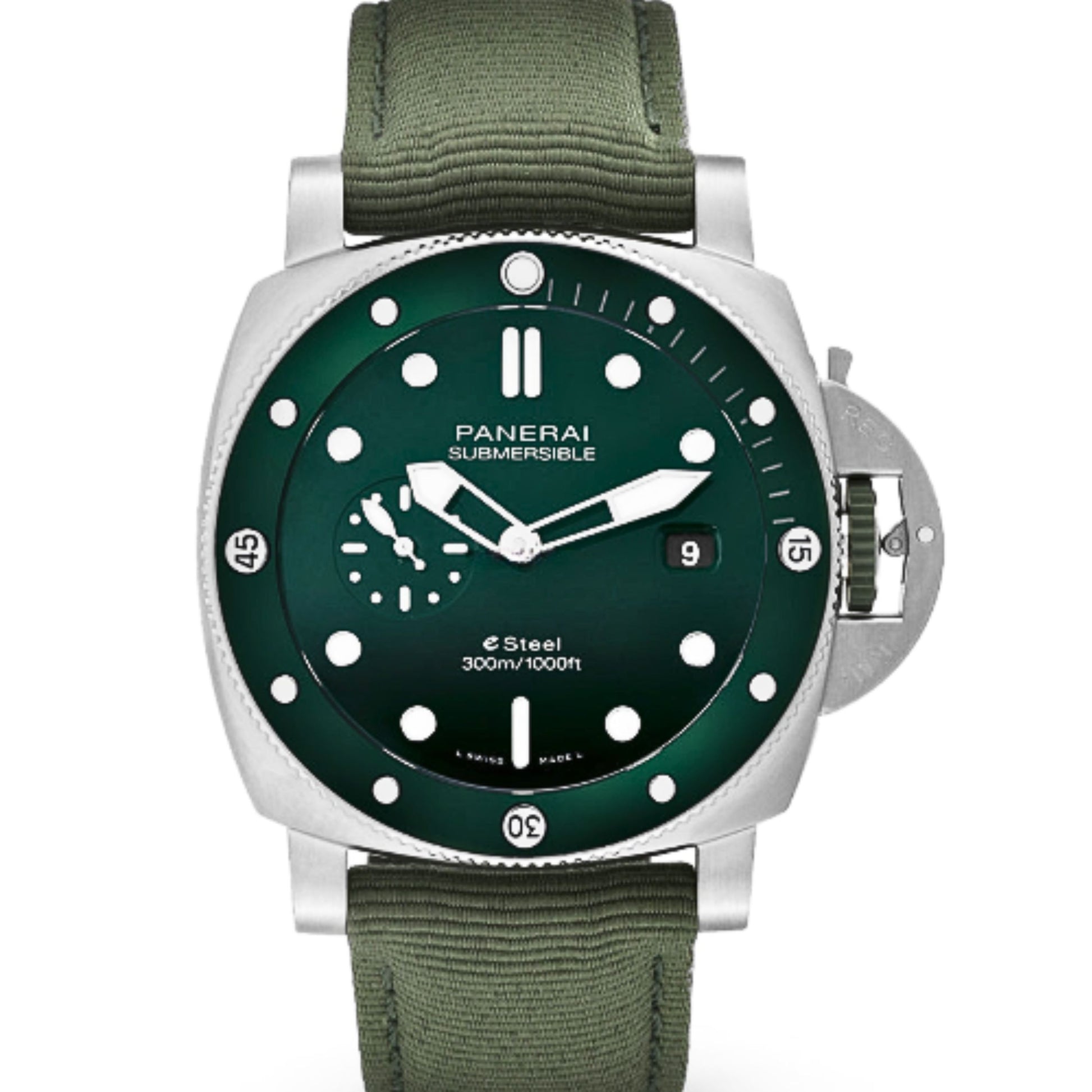 Submersible QuarantaQuattro Verde Smeraldo, PAM 1287 Automatic mechanical, P.900 calibre Brushed eSteel™ ceramic anti-clockwise rotating bezel with graduated scale,