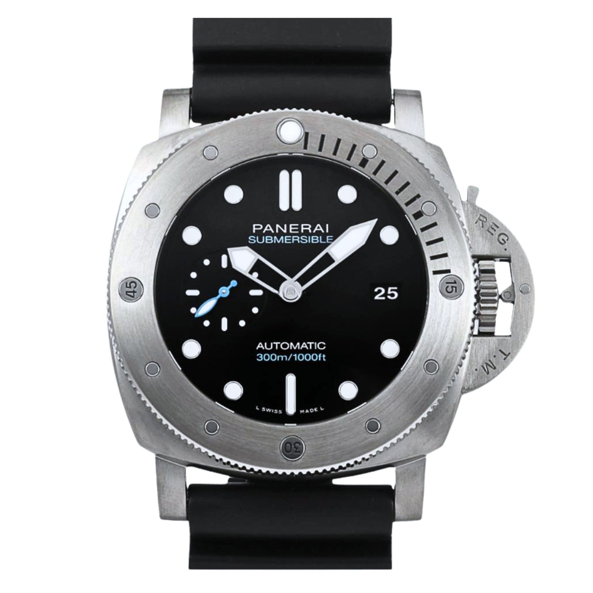 Submersible Titanio, PAM 2305 Automatic mechanical, P.9010 calibre Brushed titanium with polished edges. Anti - clockwise rotating bezel with graduated scale,