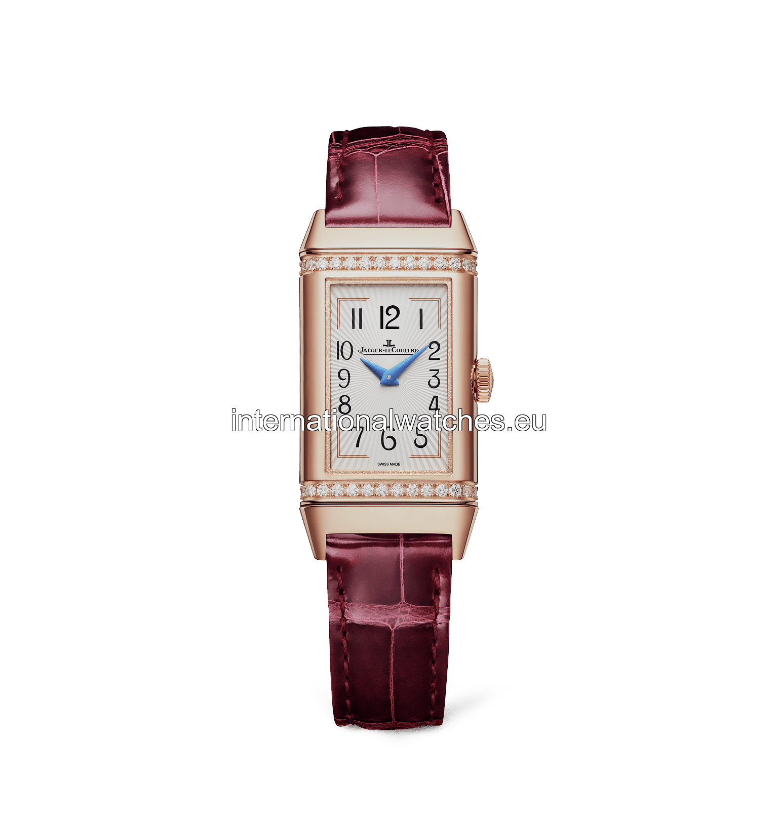 The Reverso One Duetto revisits the codes of the first feminine Reverso models, emblematic of the Art Deco style: a rectangular and elongated case, dials with contrasting aesthetics, a double set of hands turning in opposite directions while indicating the same time, gadroons adorned with two rows of brilliant-cut diamonds, alligator leather strap... On the verso of the watch, the burgundy, glitter-lacquered dial highlights the elongated hour markers, which beam like rays of sunlight. Wearable on any occasion, this model combines inimitable style with refined femininity.