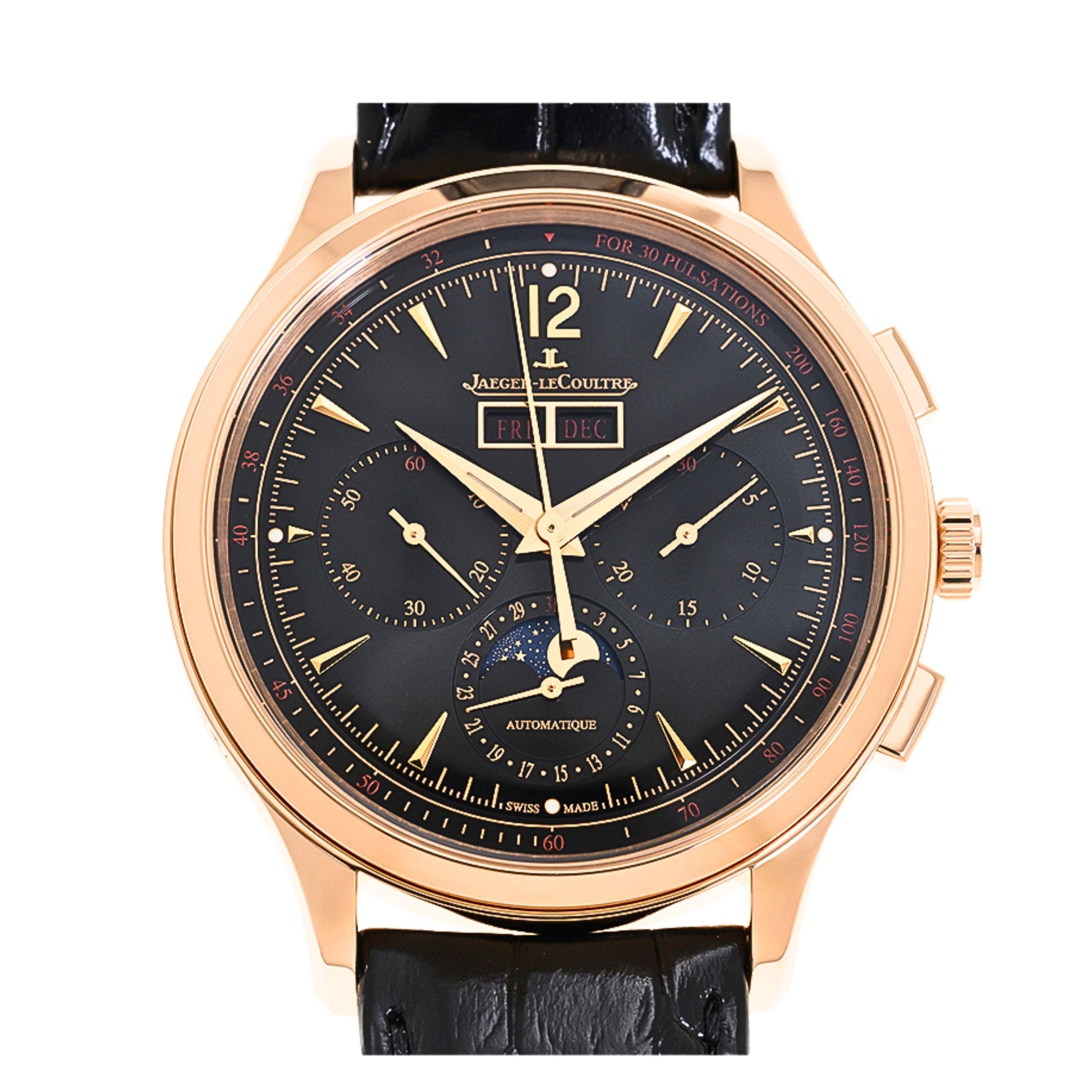 Black, gold and red. Three colors adorn the Master Control Chronograph Calendar with its resolutely modern black sunray dial. The new pink gold version showcases an elegant take on the Master Control collection's hallmark codes that have made it an icon of watchmaking sophistication. Red stands out on the chronograph, small second and moon phase counters, the digits of the center date window, as well as those of the pulsometer scale. Incredibly pleasant to wear, the Master Control Chronograph Calendar watch boasts the intricate Calibre 759 — entirely designed, produced and assembled within the Grande Maison.