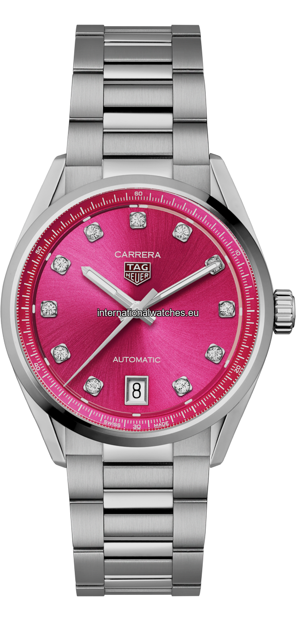 Experience timeless elegance with the TAG Heuer Carrera Date, featuring a captivating 36mm steel case and a vibrant pink snail-brushed dial that radiates feminine charm. This bold timepiece is adorned with 11 VS diamonds totaling 0.22 ct set as hour markers, enhancing its luxurious appeal.