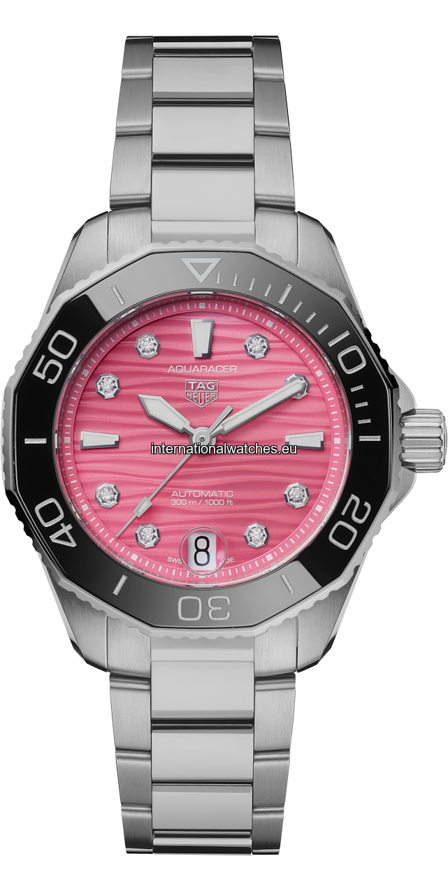 A true diving watch, this TAG Heuer Aquaracer makes a splash with its 36mm case and a fresh dial in bold pink. Featuring a wave motif, this pressure-proof professional model can endure any conditions and is an essential ally in your achievement.