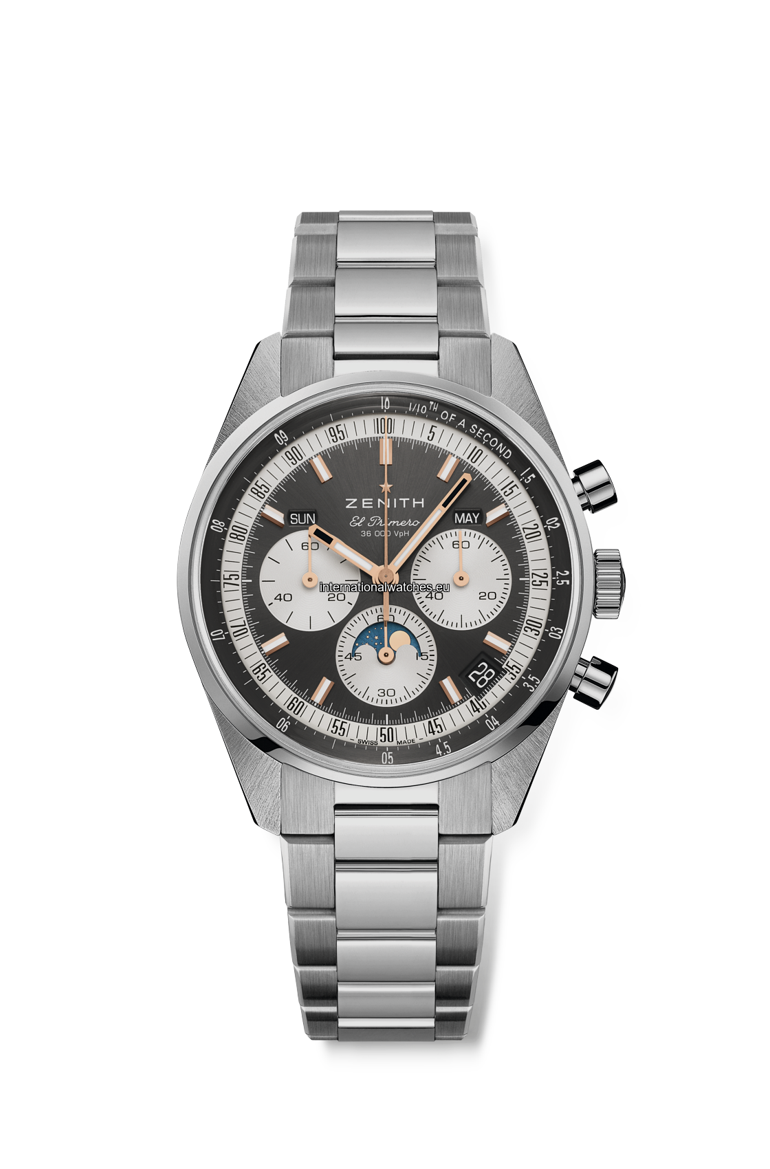 The CHRONOMASTER Original Triple Calendar is crafted in a 38mm steel case with steel bracelet, paired with a sunburst slate-grey dial displaying the day, date month and moonphase. Powered by the El Primero 3610 automatic high-frequency chronograph movement with 1/10th of a second chronograph function and a power reserve of 60 hours.