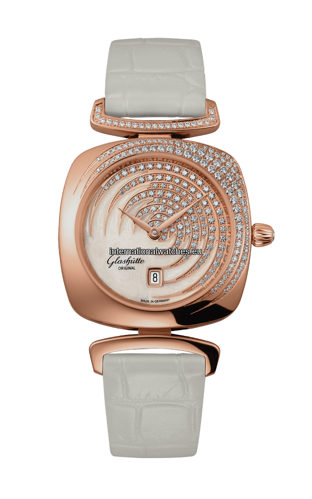 A shining delight wherever you are: the Pavonina ladies’ watch in red gold with diamonds on dial, bezel and lug. White-beige leather strap.