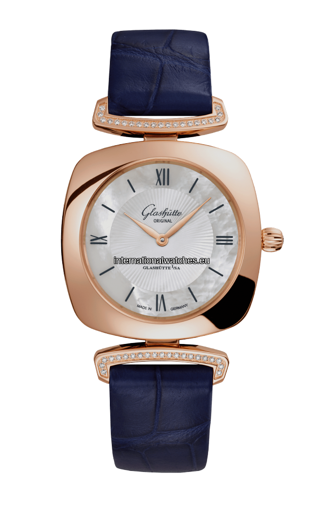 Multifaceted in red gold: the Pavonina from Glashütte Original. White mother-of-pearl dial, blue leather strap, crown and lugs with diamonds.