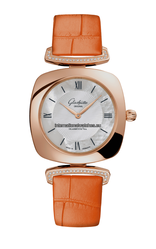 Multifaceted in red gold: the Pavonina from Glashütte Original. White mother-of-pearl dial, red/orange leather strap, crown and lugs with diamonds.