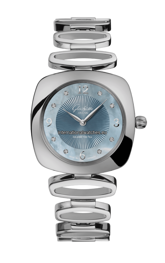 Modern and sophisticated: the Pavonina womens’ watch from Glashütte Original. Stainless steel, blue mother-of-pearl dial, metal bracelet.