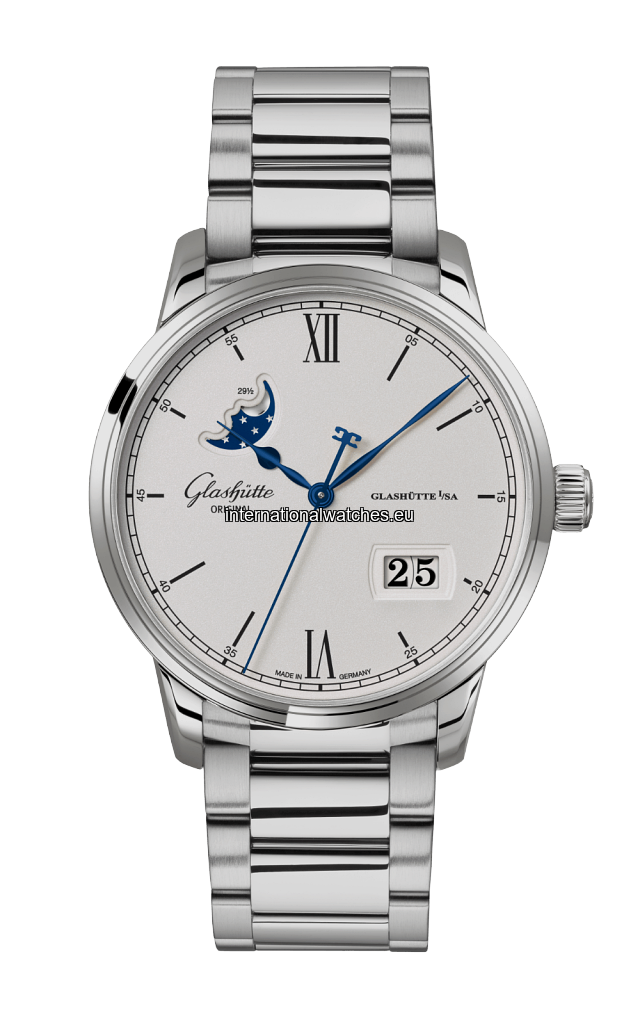 The Senator Excellence Panorama Date Moon Phase impresses with its clear and elegant design. Stainless steel, silver dial, metal bracelet.