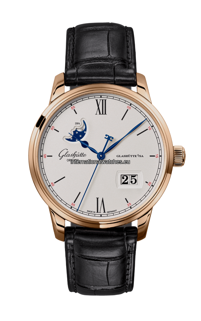 Exquisit, elegant, artfully crafted: The Senator Excellence Panorama Date Moon Phase. Red gold watch with moon phase, silver dial, black leather strap.