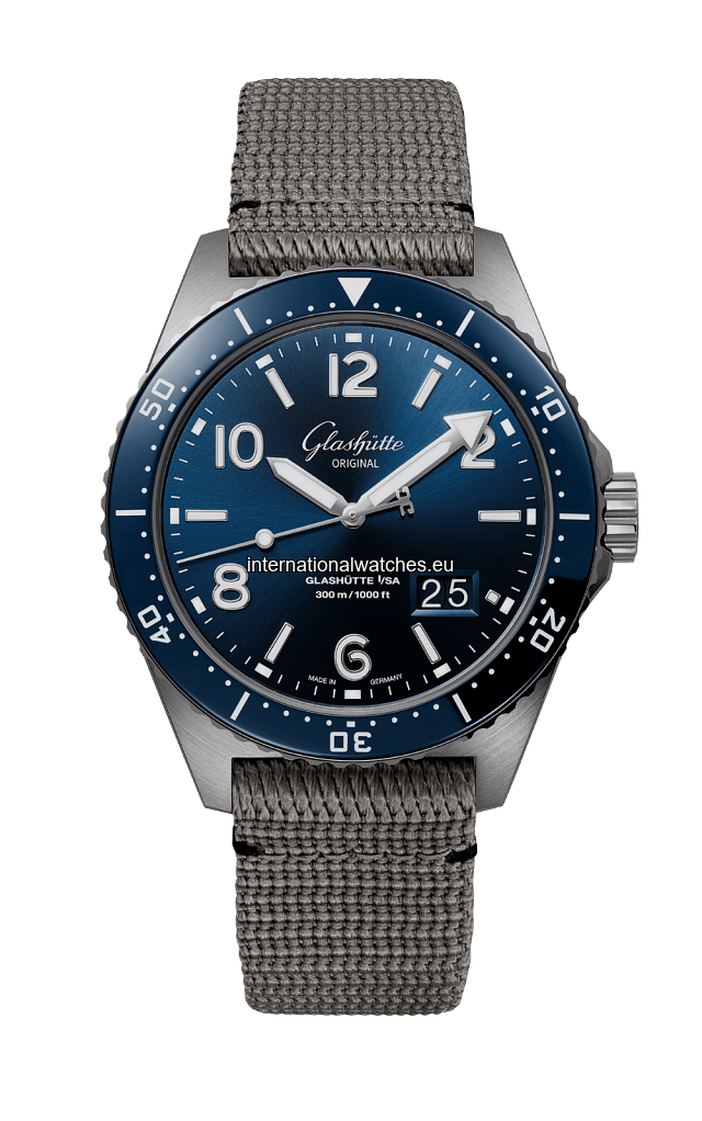 Stylish, secure, precise: The SeaQ Panorama Date. A diver’s watch with water resistance up to 30 bar. Blue dial, stainless steel, synthetic strap grey.