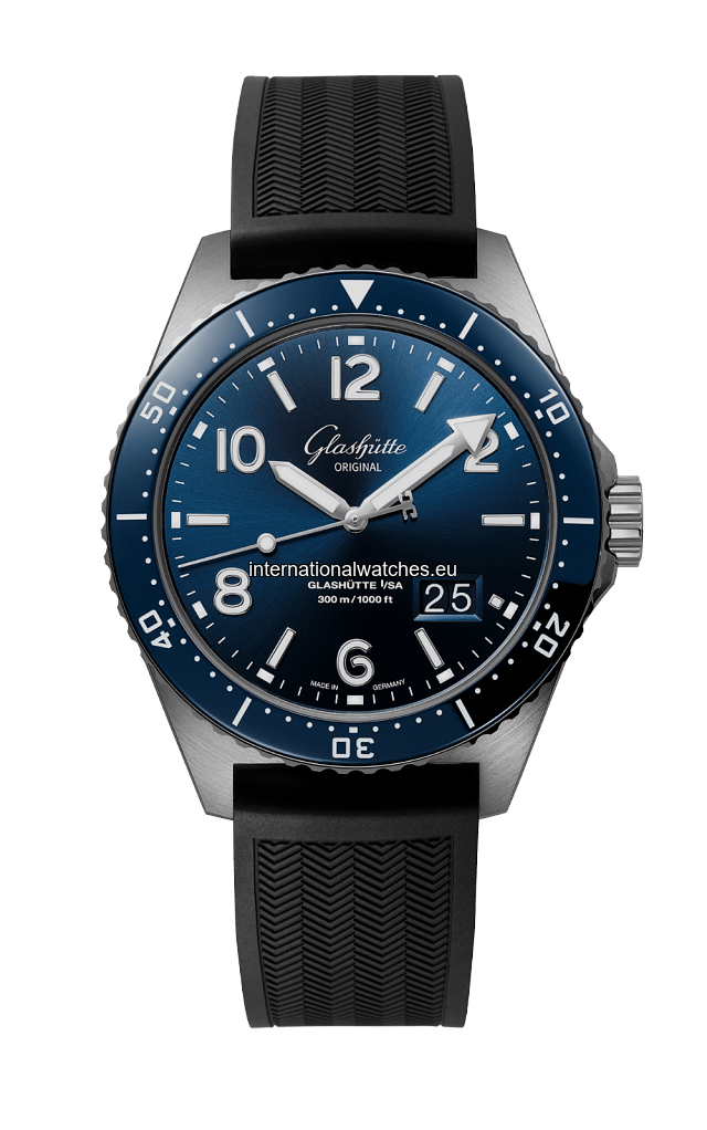 Stylish, secure, precise: The SeaQ Panorama Date. A diver’s watch with water resistance up to 30 bar. Blue dial, stainless steel, rubber strap black.