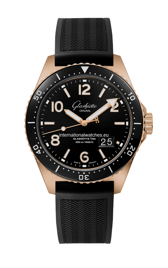 The SeaQ Panorama Date in red gold with black dial. A sporty, elegant diver’s watch with 36-13 calibre. Water proof up to 30 bar. Rubber strap black.