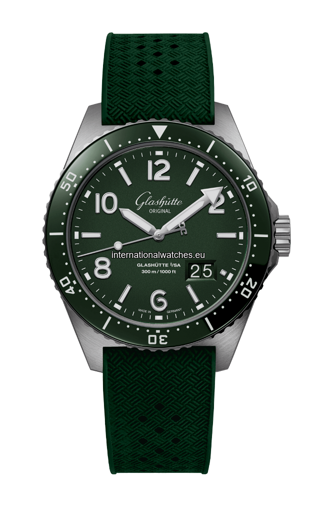Glashütte Original SeaQ Panorama Date: A perfectly legible and precise diver’s watch with water resistance up to 30 bar. Green dial, rubber strap green.