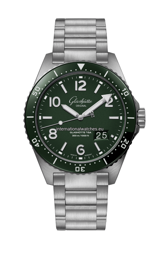 Glashütte Original SeaQ Panorama Date: A perfectly legible and precise diver’s watch with water resistance up to 30 bar. Green dial, metal bracelet.