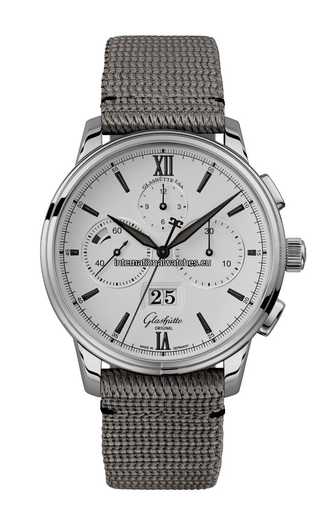 The compelling and sporty-elegant Senator Chronograph Panorama Date. Stainless steel, white dial, 12-hours counter, Super-LumiNova®, grey synthetic strap.