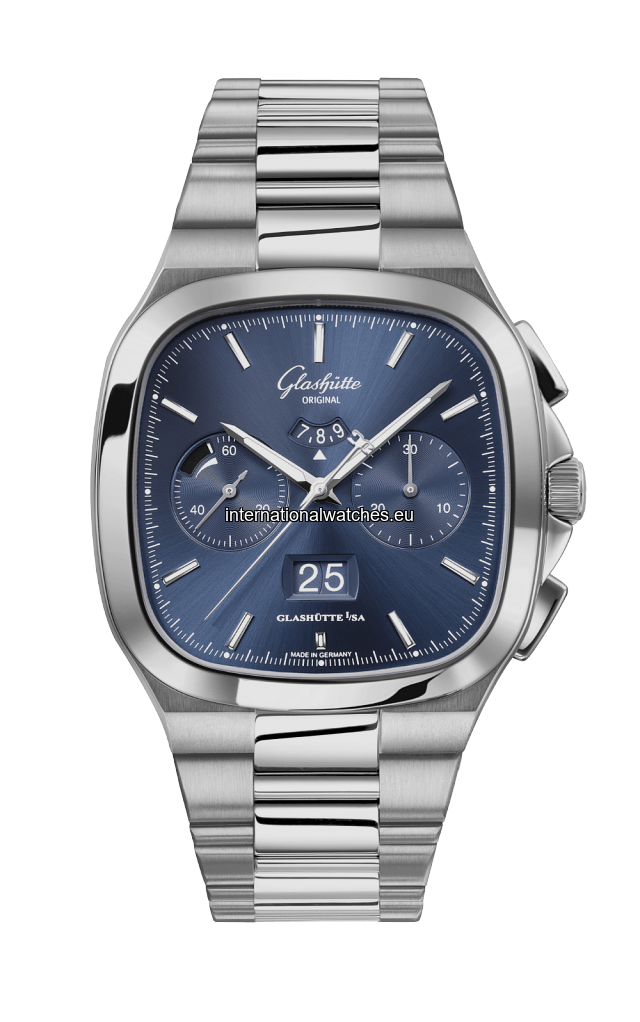 The Seventies Chronograph Panorama Date with blue dial and stainless steel square case. Automatic Movement, power reserve display, metal bracelet.