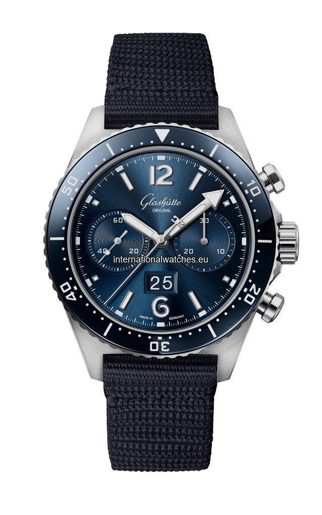 SeaQ Chronograph: sporty, robust, stylish. Rigorous tests in line with DIN & ISO norms guarantee maximum precision. Stainless steel, synthetic strap blue.