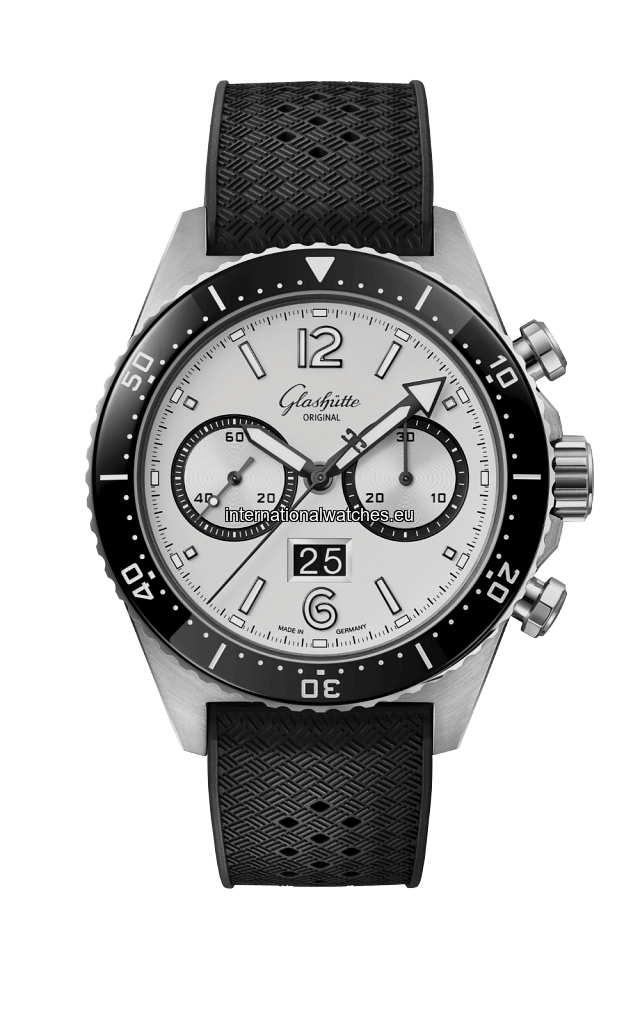 The SeaQ Chronograph in black and white with ‘Silver Screen’ dial: robust, sporty and elegant, highly precise. Water-resistant to 30 bar. Rubber strap.