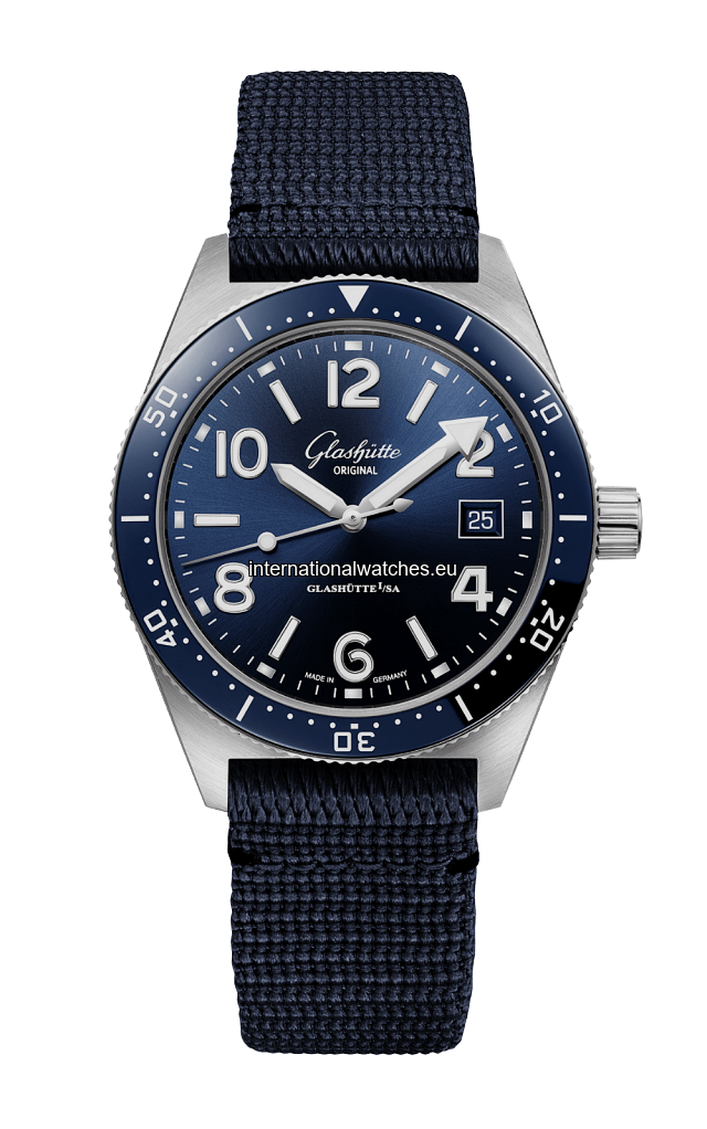 SeaQ with blue dial: a diver’s watch with water resistance of up to 20 bar. Very high-contrast for good legibility. Stainless steel, synthetic strap.