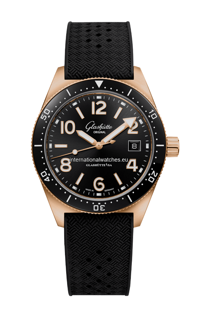 At once sporty and elegant: The SeaQ in red gold with black dial. Water resistance up to 20 bar and perfectly legible. With black rubber strap.