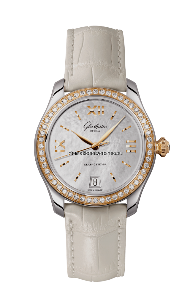 Lady Serenade in bi-colour: a timeless, beautiful womens watch from Glashütte Original. Mother-of-pearl dial silver, small date, leather strap.