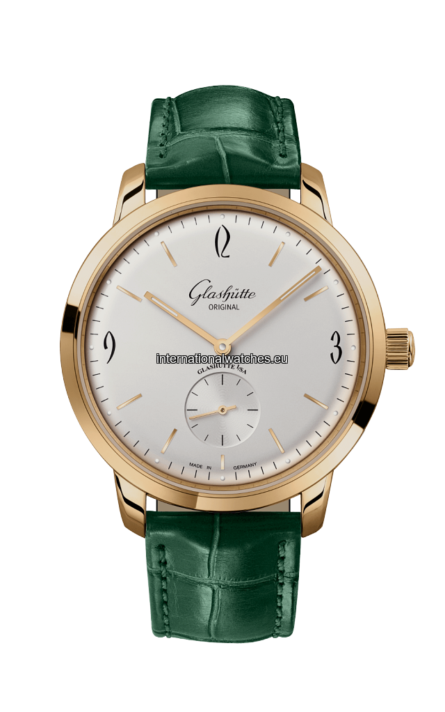 Sixties Small Second: an elegant timepiece in a subtle retro design with small second. Flat rose gold case, silver dial, leather strap in green.