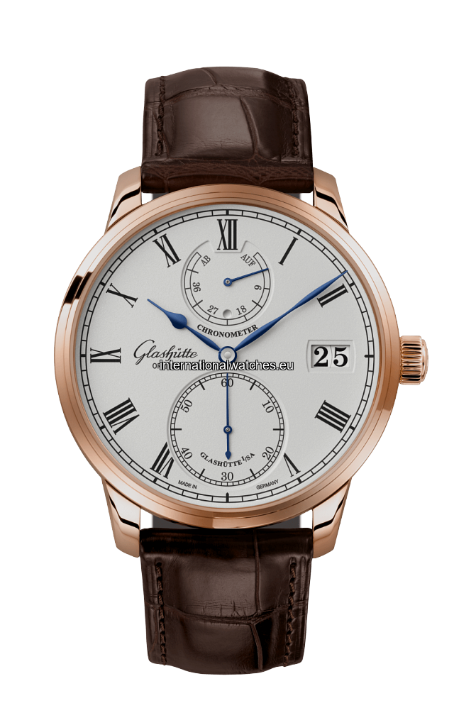 Elegant, certified, precise to the second: The Senator Chronometer. Red gold watch, silver dial, second-stop mechanism, Panorama Date, brown leather strap.
