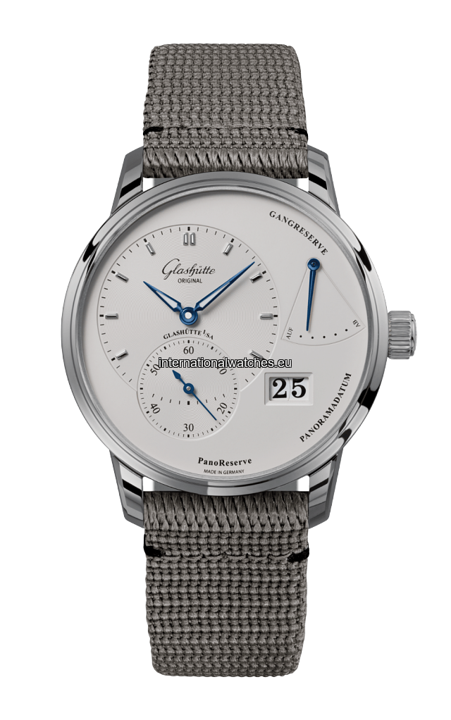 The PanoReserve in stainless steel impresses with is understated elegance. Silver dial, Panorama Date, power reserve display, grey synthetic strap.